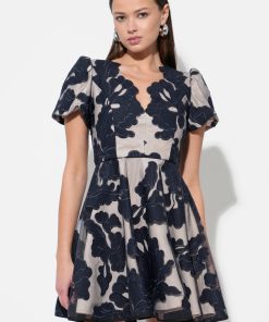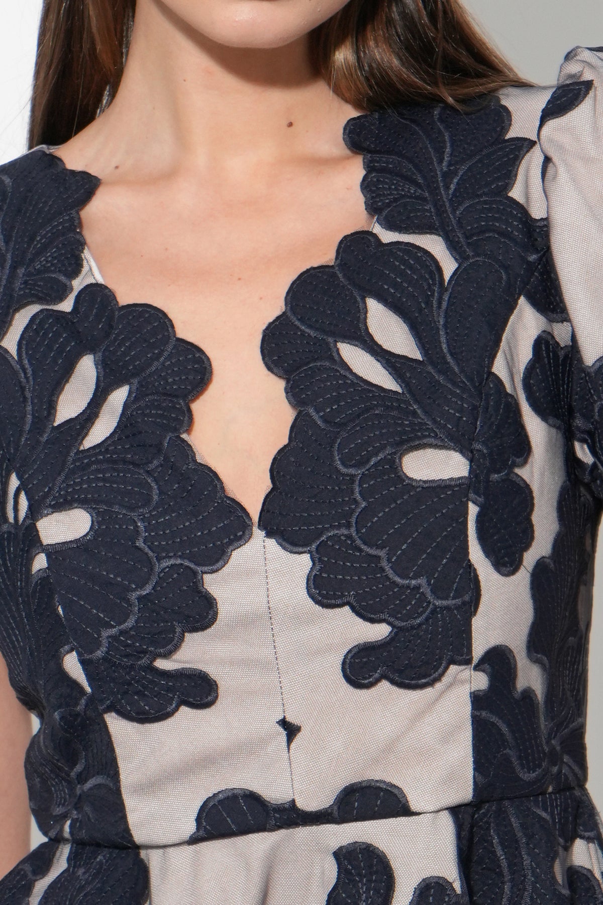 It features a nude-colored base fabric layered with a delicate, sheer navy mesh overlay that is adorned with a beautiful, all-over floral embroidery pattern. The dress has a flattering mini length and a defined A-line silhouette.