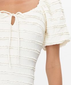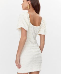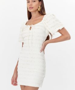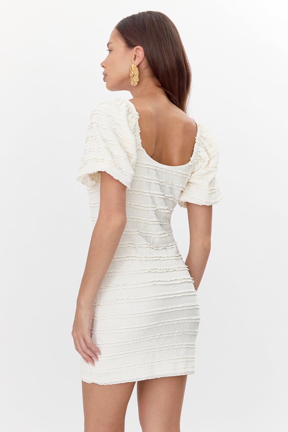 Textured mini dress featuring a round neckline with a tie detail. The silhouette is form-fitting and adorned with short, puff-sleeves.