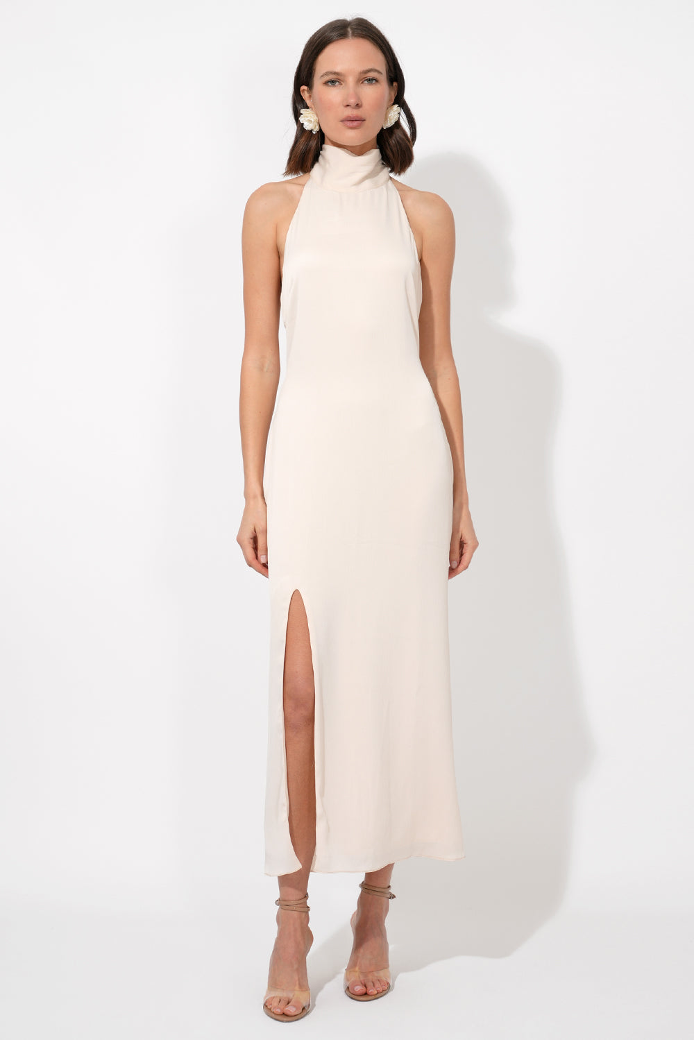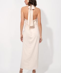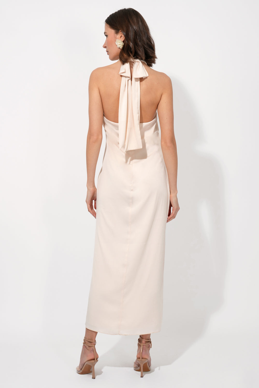 The Alize Halter Maxi Dress is your answer to every “what do I wear?” moment. Designed in a soft, champagne-tone satin with a high neckline and bold front slit, this stunner shows off just enough skin with its open back and dramatic bow tie detail.