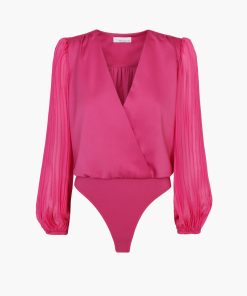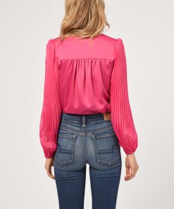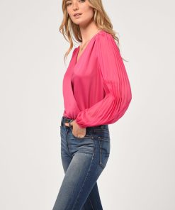 This top offers an ultra-feminine look with its pleated organza balloon sleeves and wrap-over styling. Its folded texture lends to a unique, stylish shape, ensuring your look stands out.