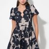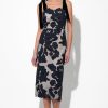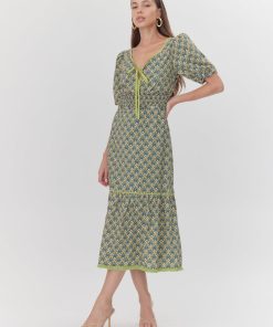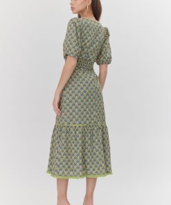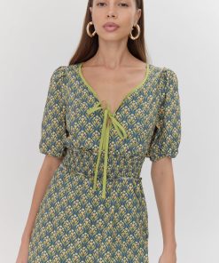 This puff sleeve dress shows off a smocked waist and tied neckline. Rendered in a floral print, the silhouette falls to a midi length with a flared skirt and fringed hem.