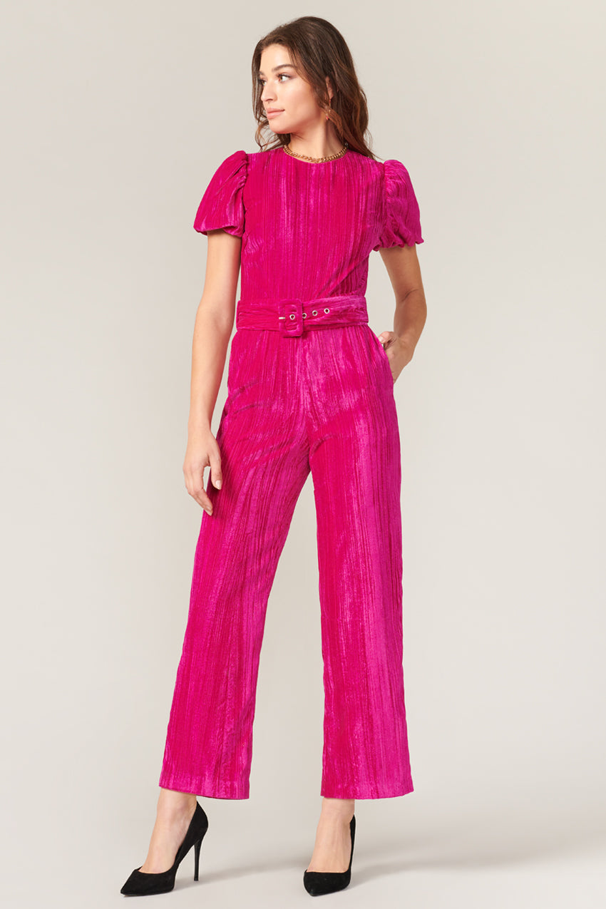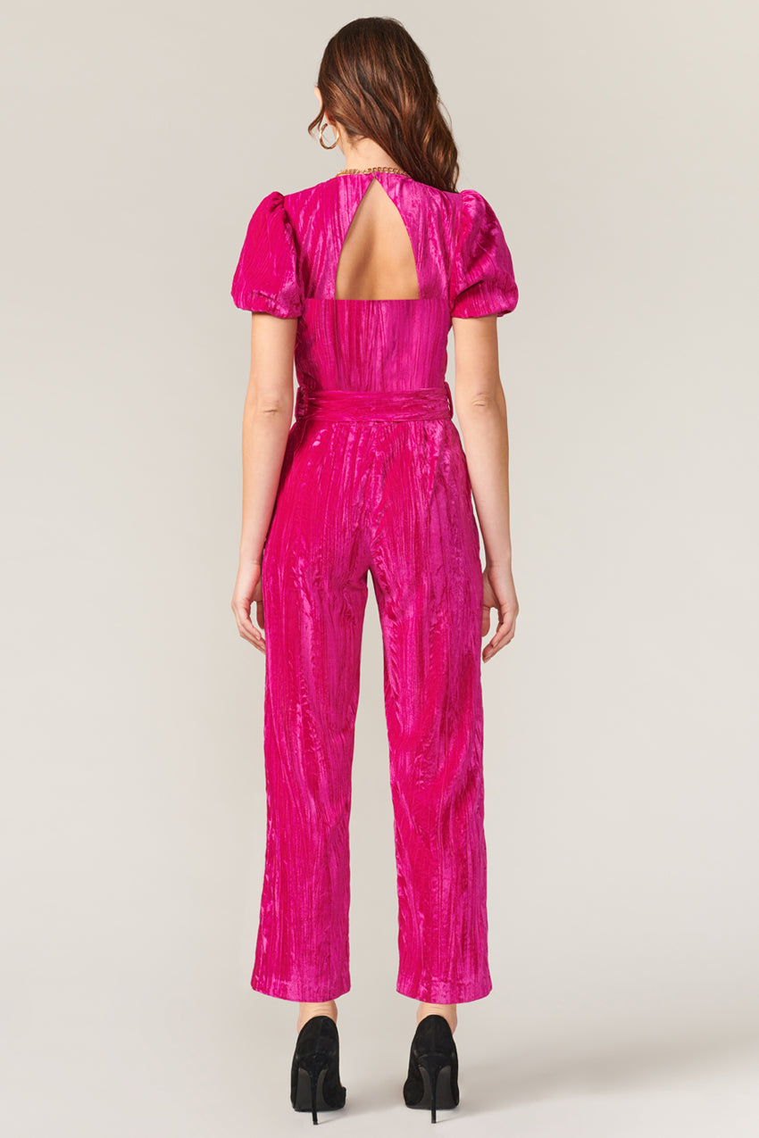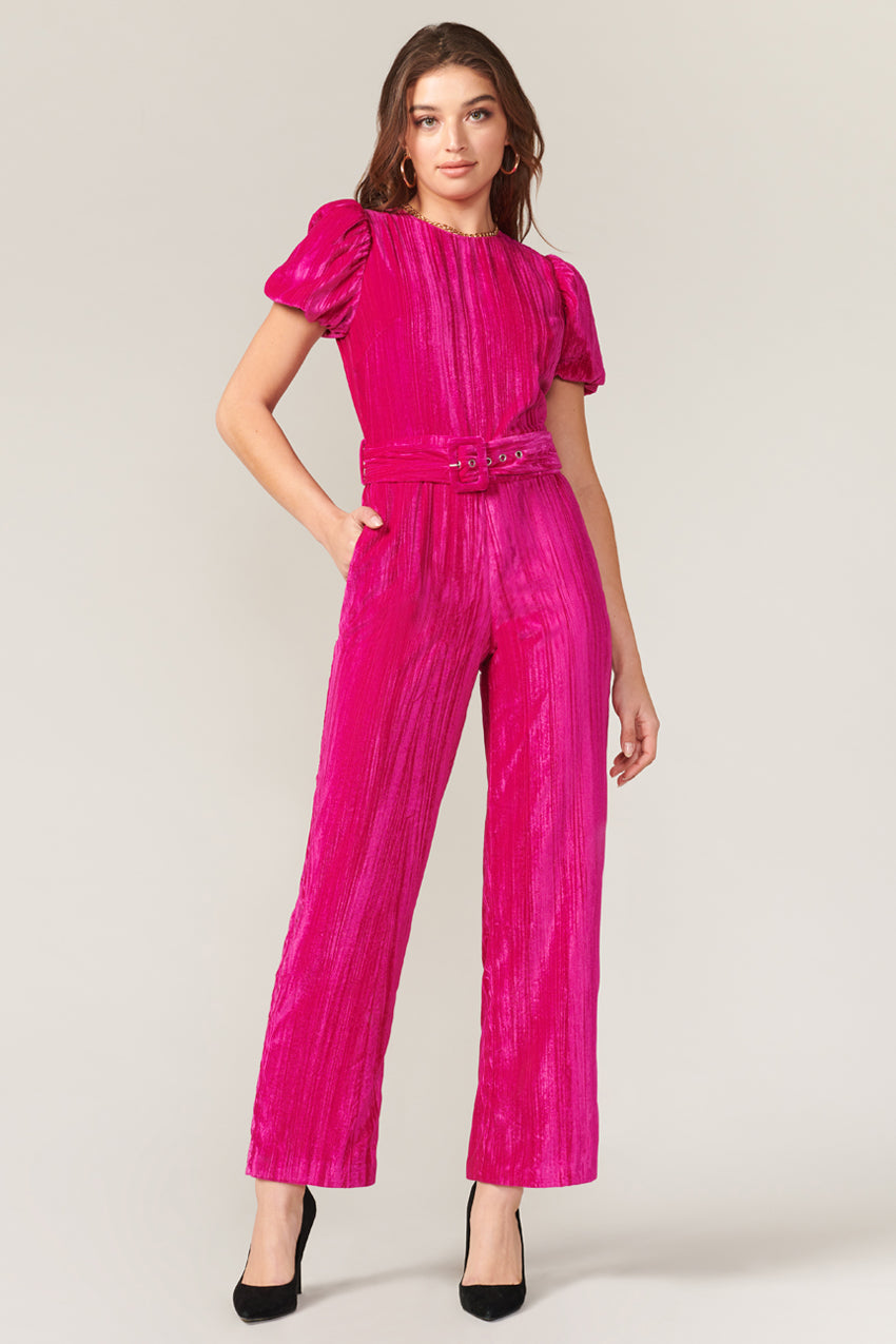 This textured velvet jumpsuit embraces the 70’s inspired glamour. Designed in a crew neckline, puff sleeves, belt and belt loops, a wide leg, and side pockets this jumpsuit will have you feeling groovy.