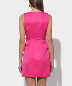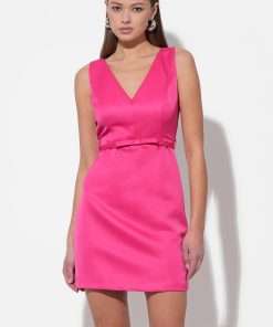 This dazzling mini dress, crafted from luxurious satin-like fabric in a bold fuchsia hue, offers a sleek and sophisticated silhouette. It features a flattering V-neckline and a tailored bodice that cinches gracefully with a subtle, self-tie belt, creating a defined waist. The skirt subtly flares out, providing a playful yet elegant movement.