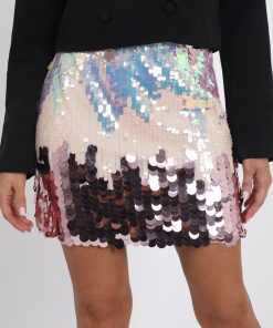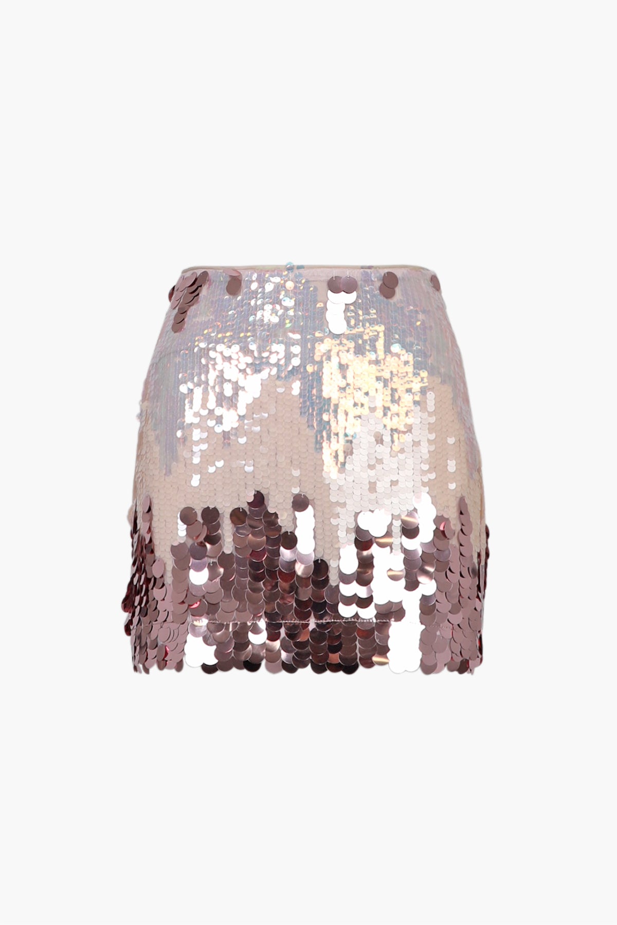 Sequin mini skirt in mixed shades of pink. Style with another sequin skirt to stand out in the night or tone it down with a minimal blouse.