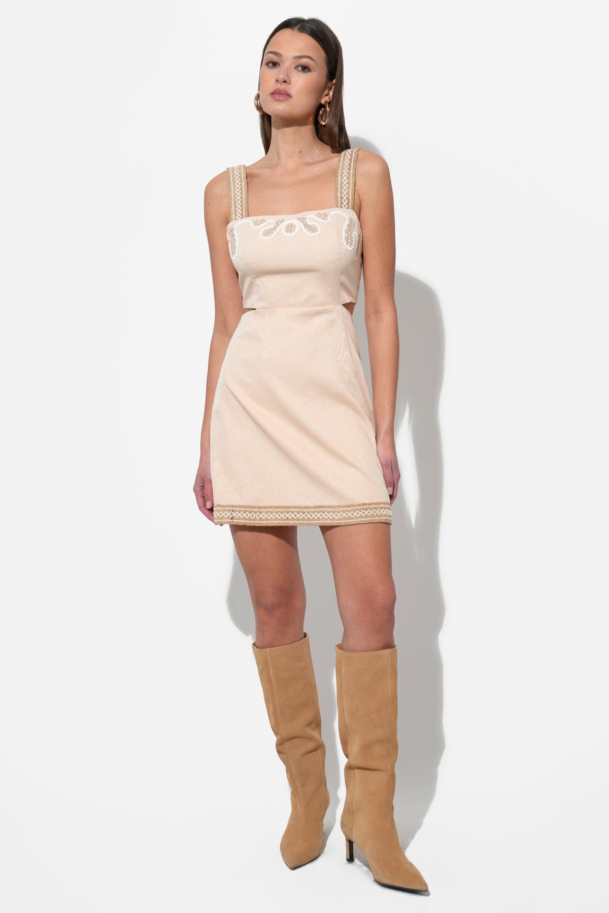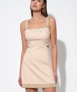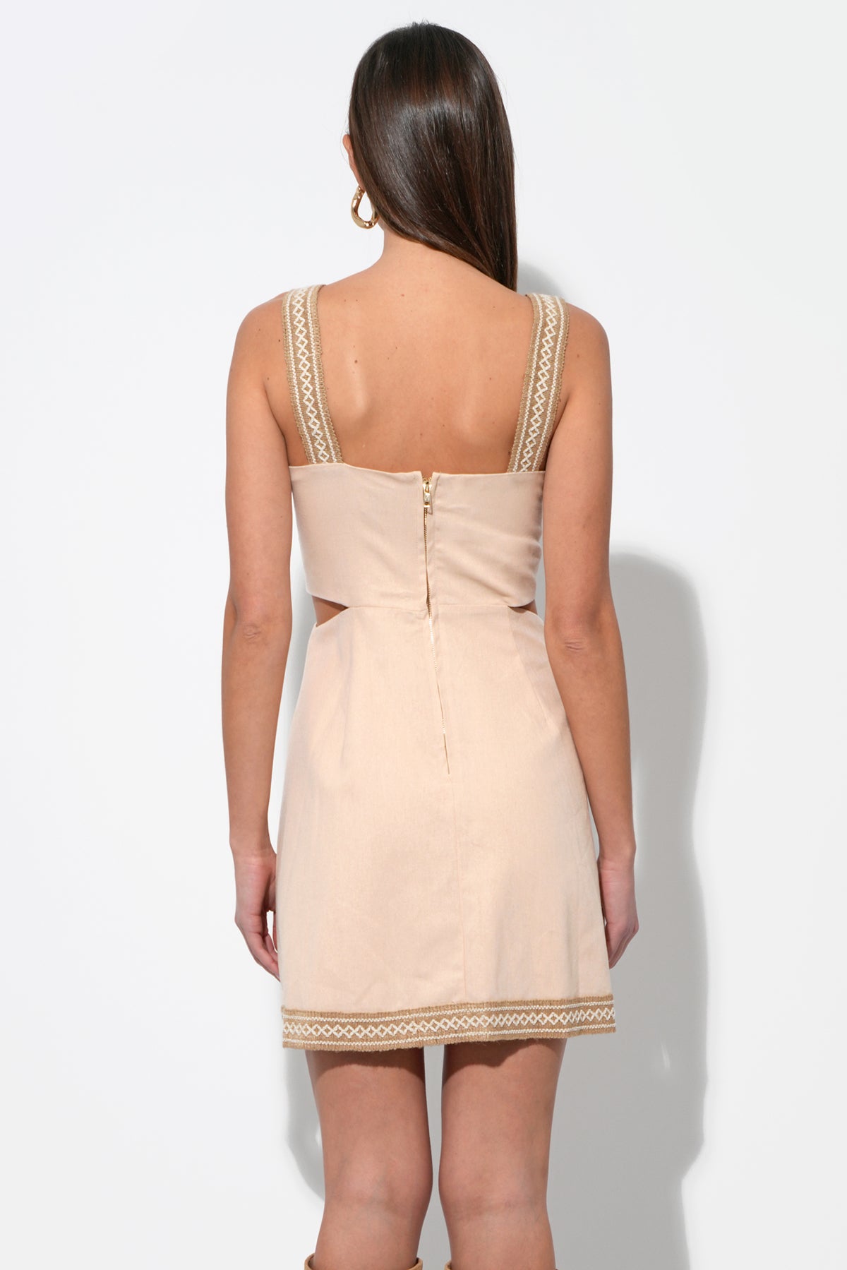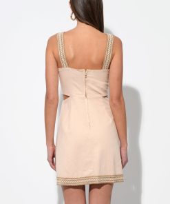 This exquisite dress in a delicate blush or sand hue features stunning, intricate embroidery in a contrasting natural tone across the square neckline and along the hem, creating a beautiful border. The wide, braided-effect straps add a unique textural element.