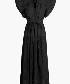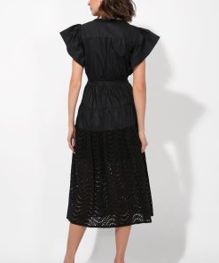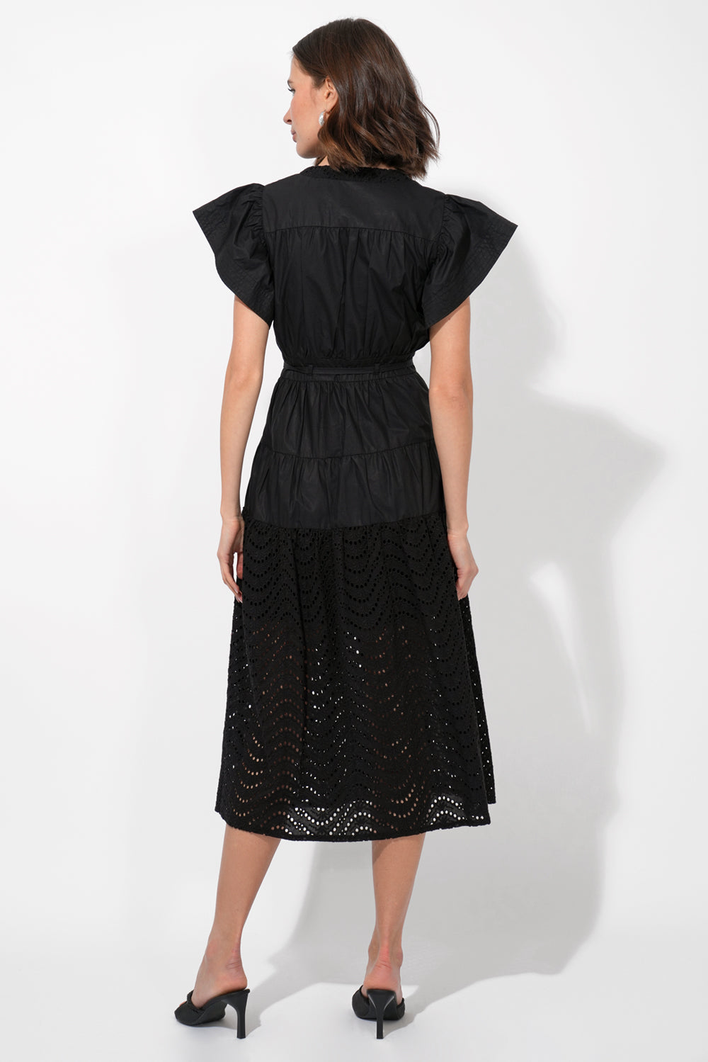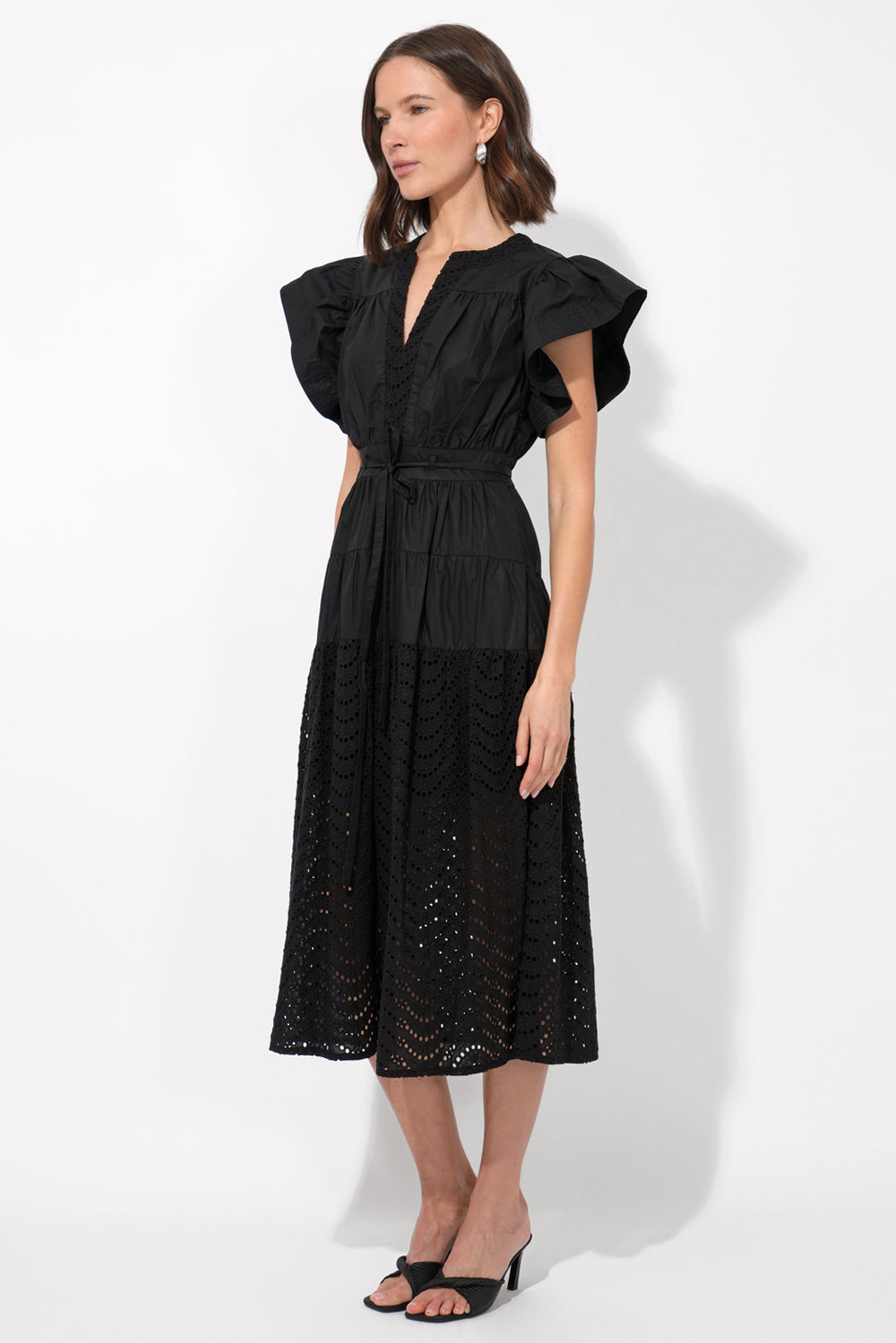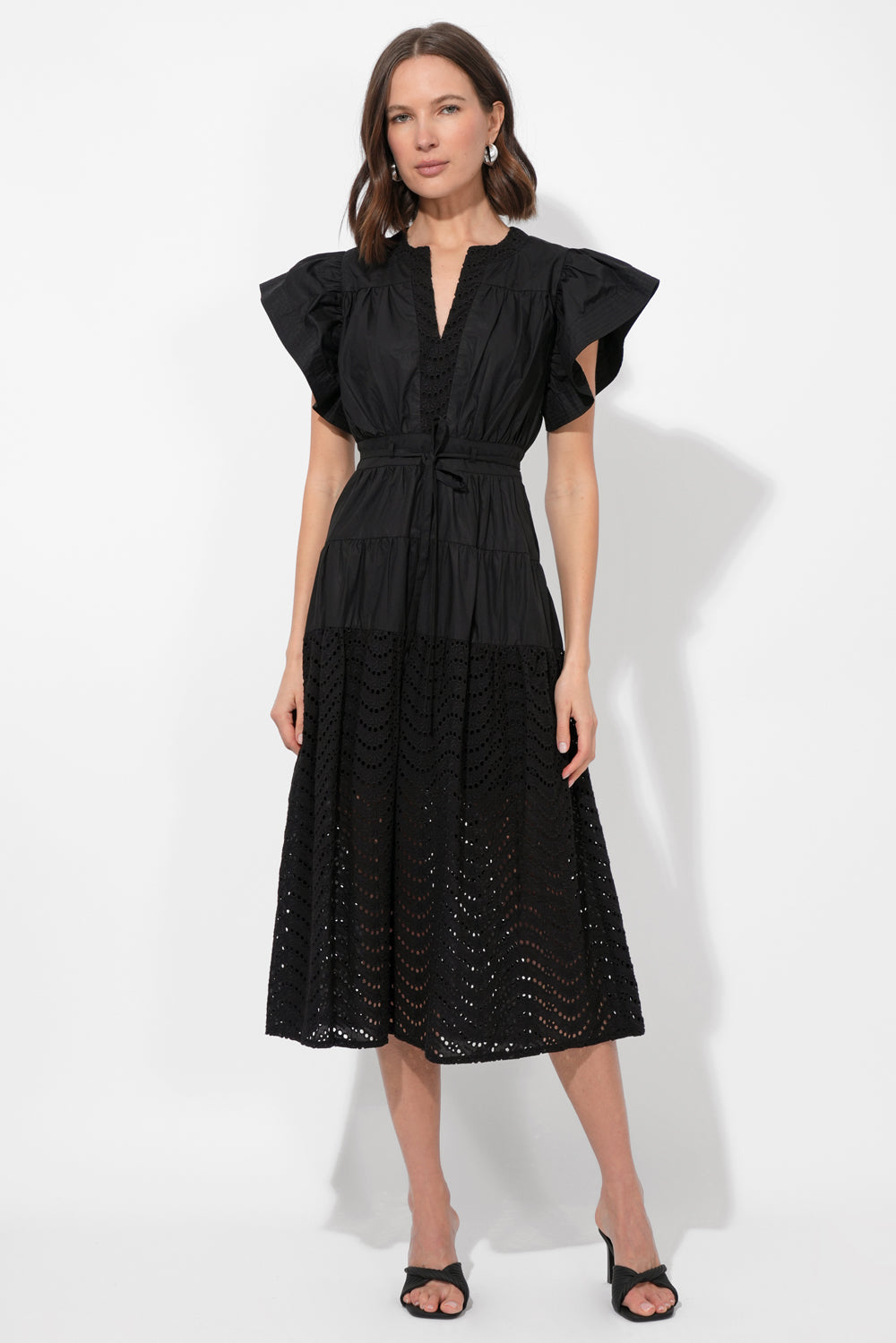 Crafted from breathable cotton poplin, this maxi dress features flutter sleeves, a tiered bodice, and a breezy eyelet-embroidered skirt that adds playful movement with every step. A tie belt cinches the waist just right, giving you a flattering shape no matter how you style it.