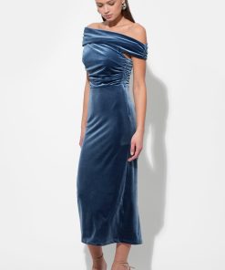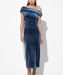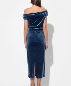 The dress features a flattering off-the-shoulder neckline with a unique, draped and ruched bodice that creates a beautiful, textural detail. The body of the dress has a slim, figure-skimming fit that falls to a midi length.