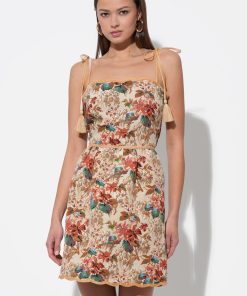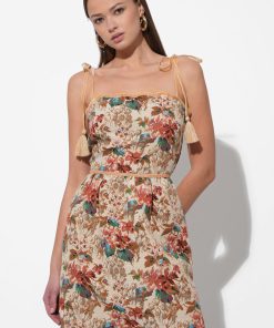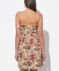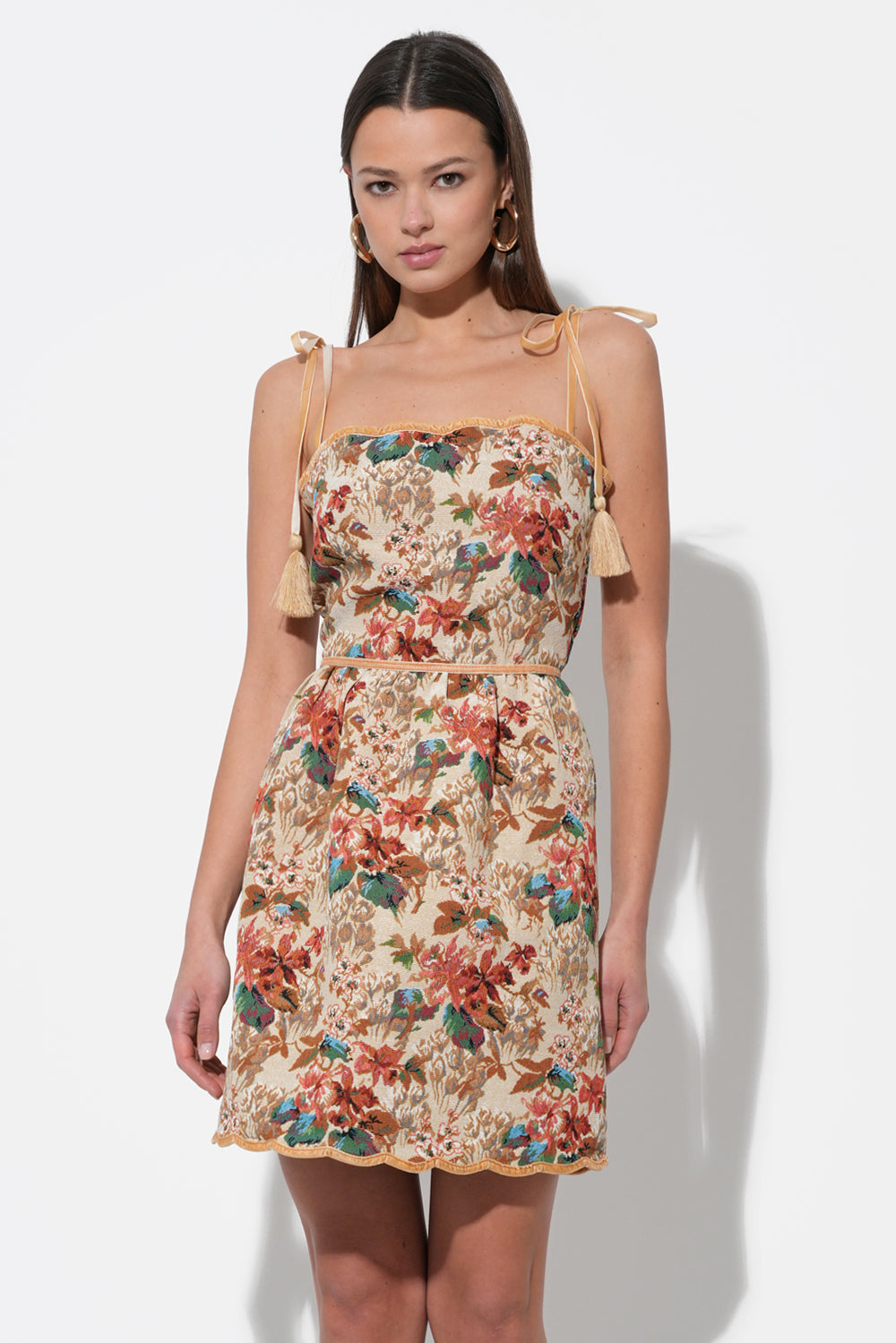 This delightful mini dress features a vibrant tapestry-inspired print in a rich palette of blues, oranges, and creams, making it a true statement piece.