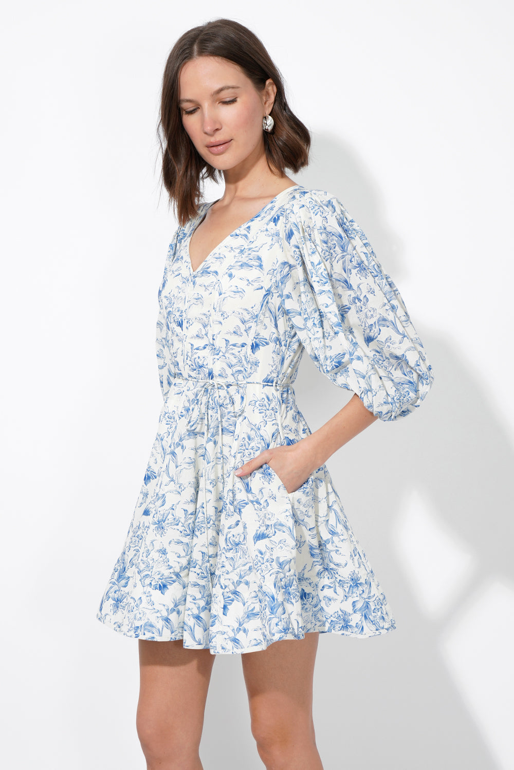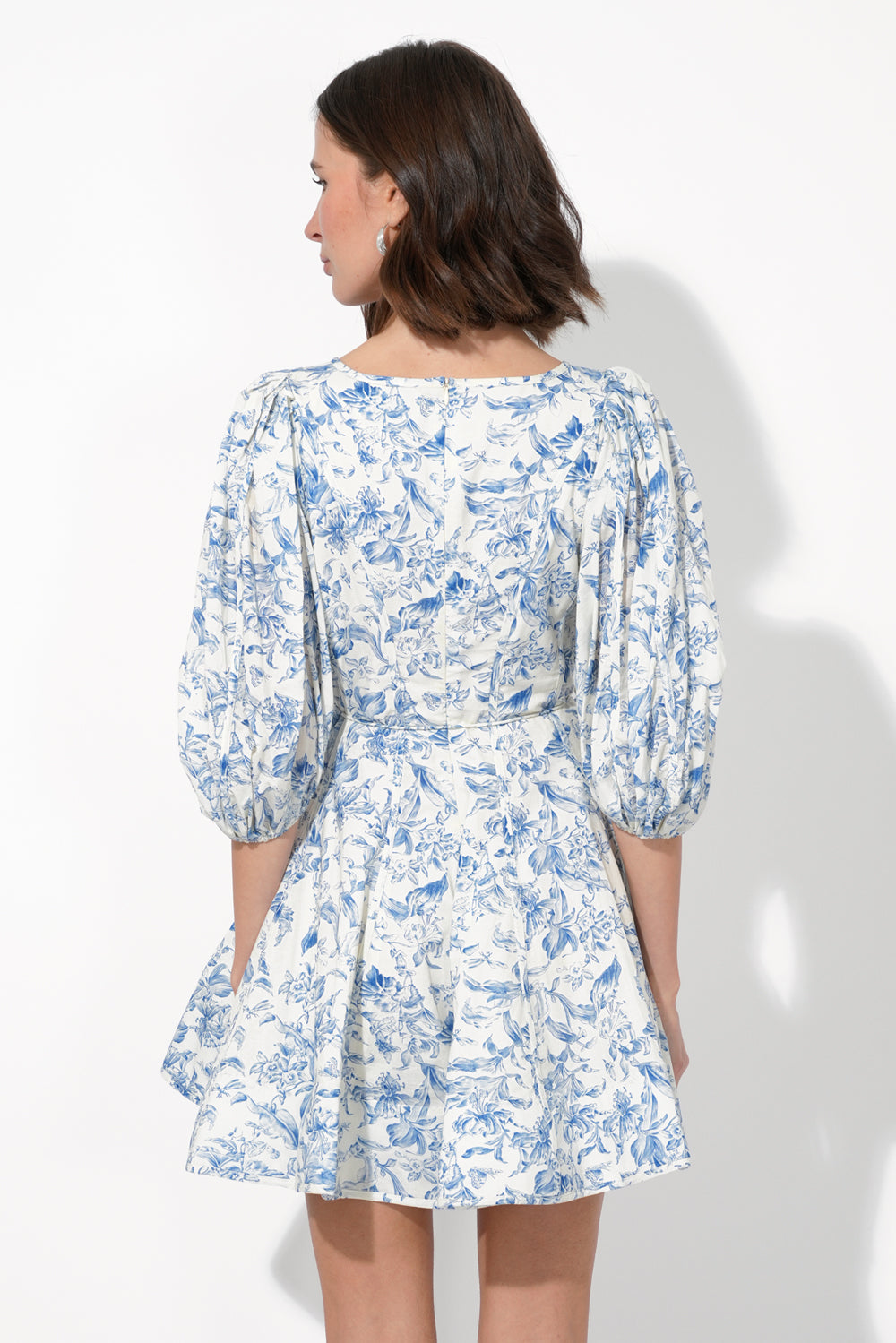 Featuring a dreamy blue and white floral print, this mini dress is all about timeless elegance with a playful twist. The voluminous balloon sleeves bring a touch of romance, while the cinched waist and flared skirt create the perfect fit-and-flare silhouette. Installed with a flattering V-neckline, a delicate tie belt, and hidden pockets.
