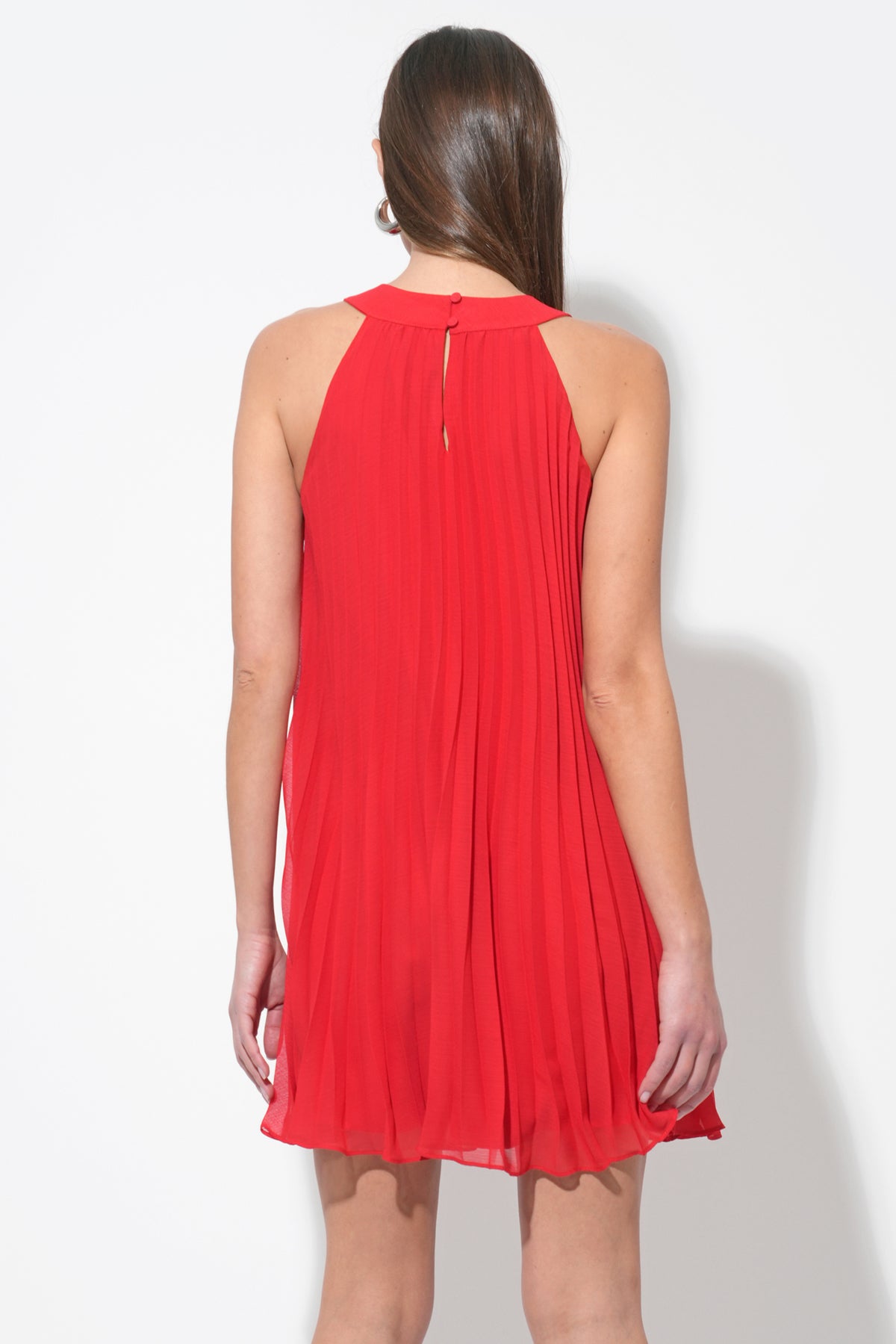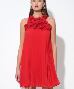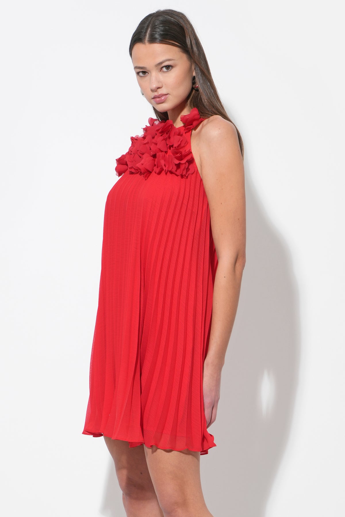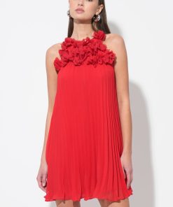 This stunning red mini dress features a unique halter neckline adorned with an array of meticulously crafted 3D floral appliques, creating a beautiful and tactile texture. The dress flows into a flattering pleated A-line silhouette, offering graceful movement and a comfortable fit.