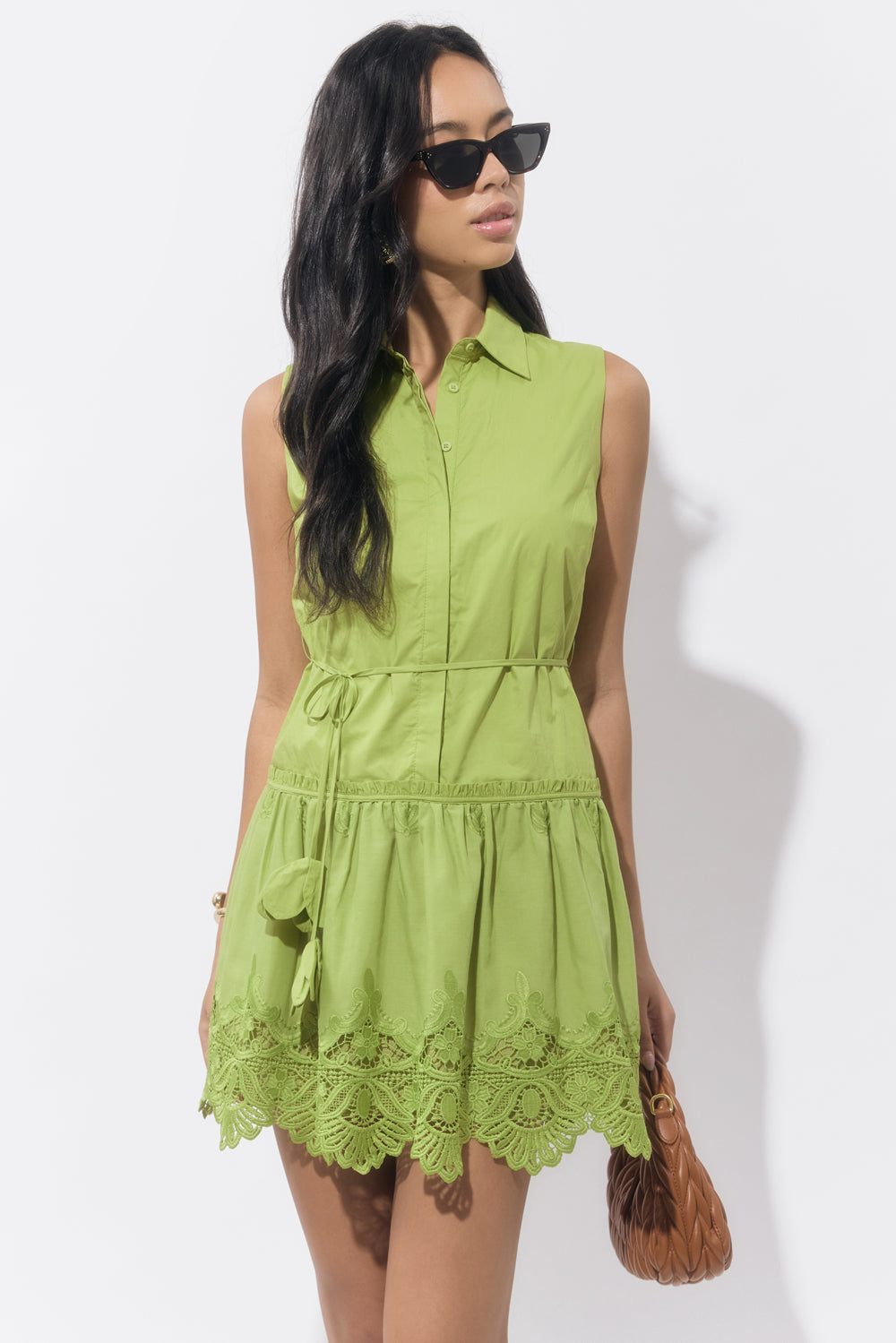 Featuring a collared neckline, drawstring waist, and detailed embroidery along the hem, this sleeveless, button-down dress balances casual charm with feminine flair. Finishing the design is a delicate scallop lace trim.