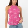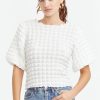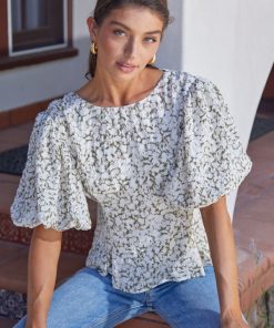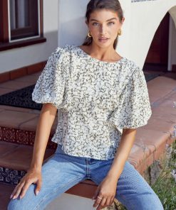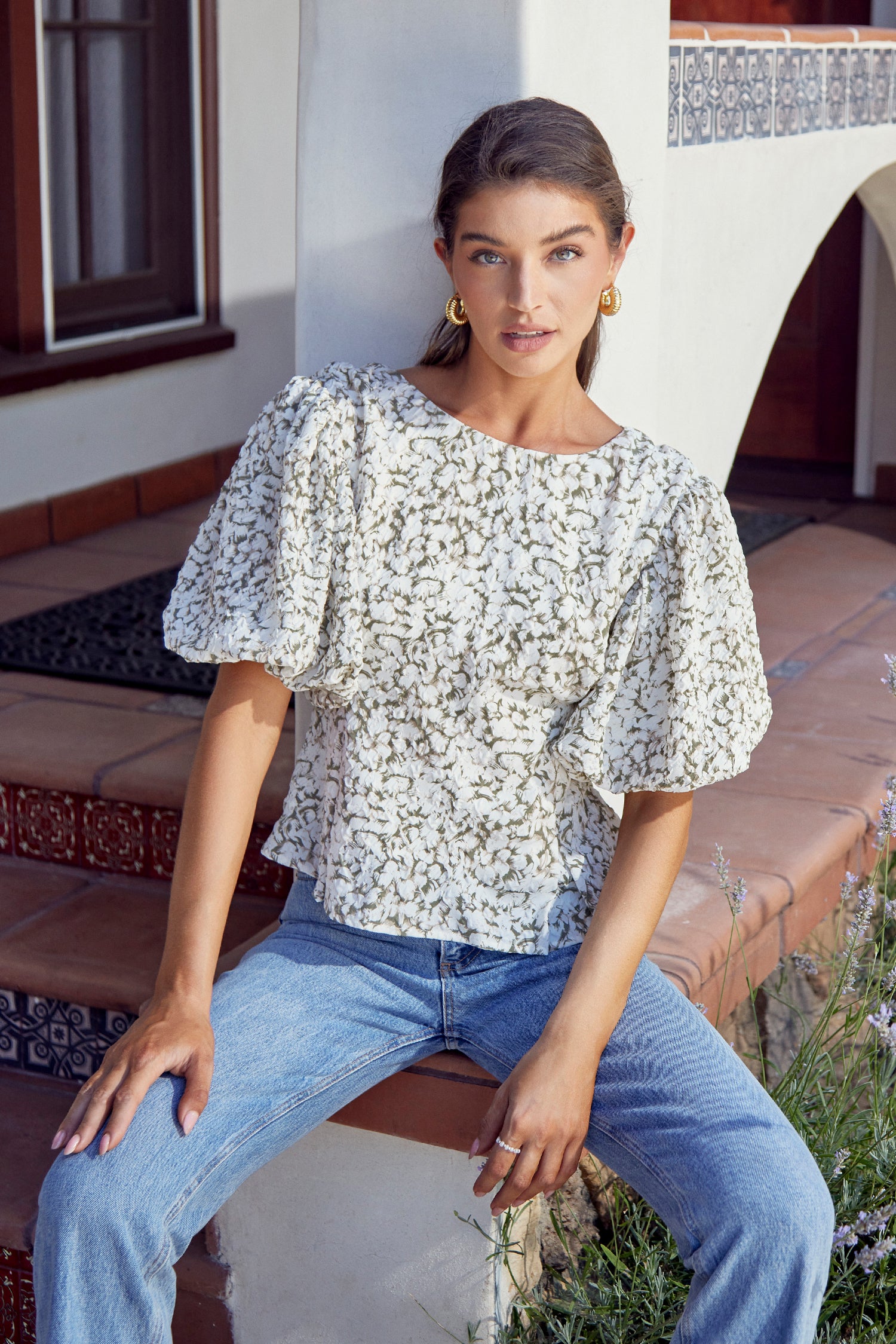 Short puff sleeve top with a surprise in the back. The blouse features a cutout back with elastic bands holding the sleeves together.