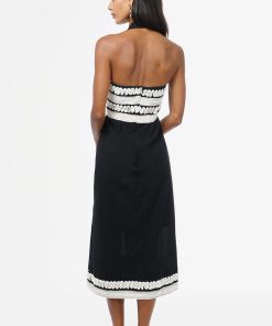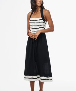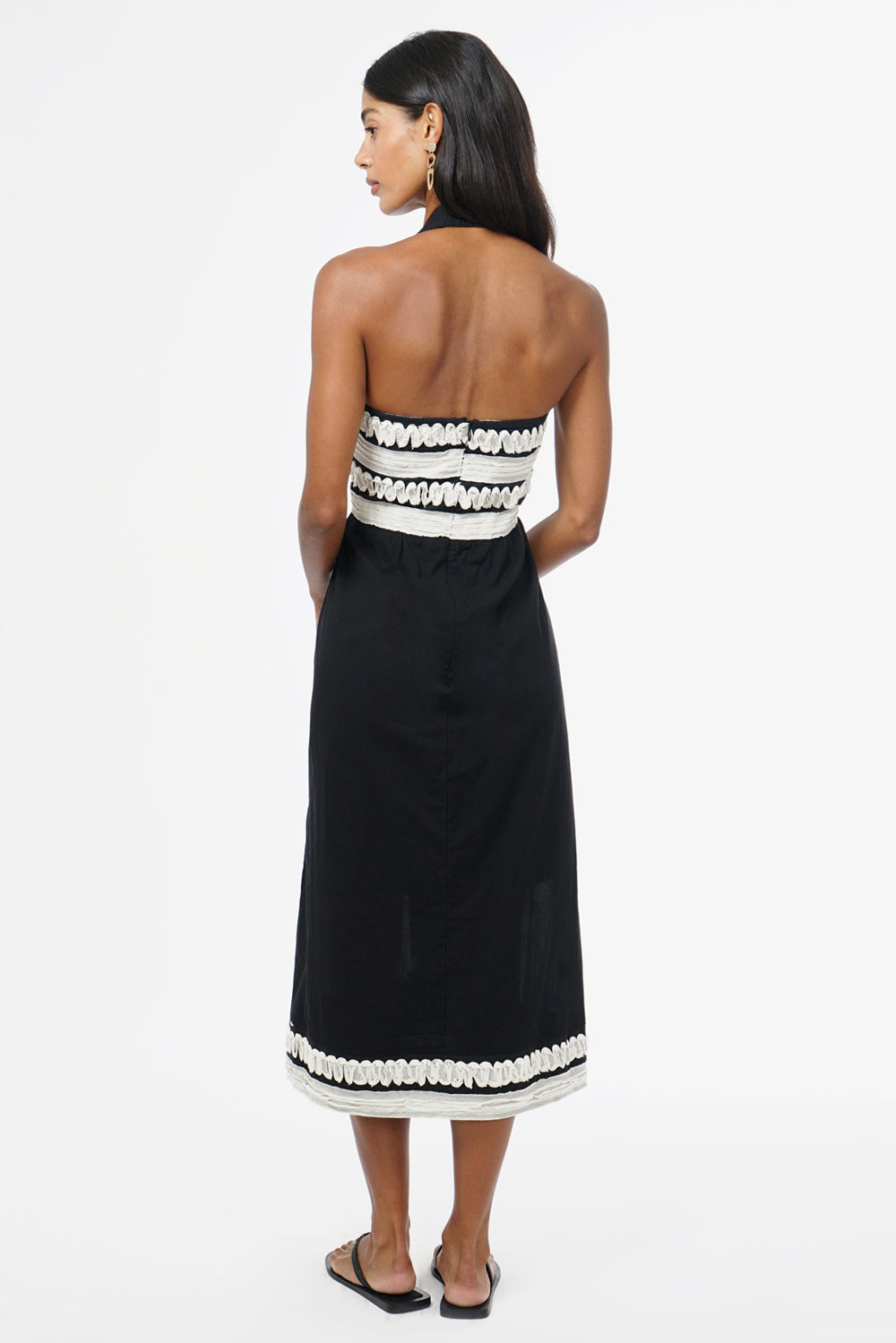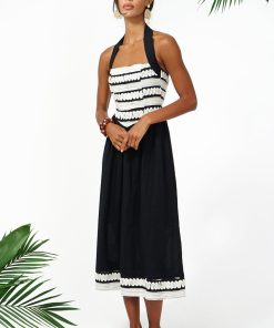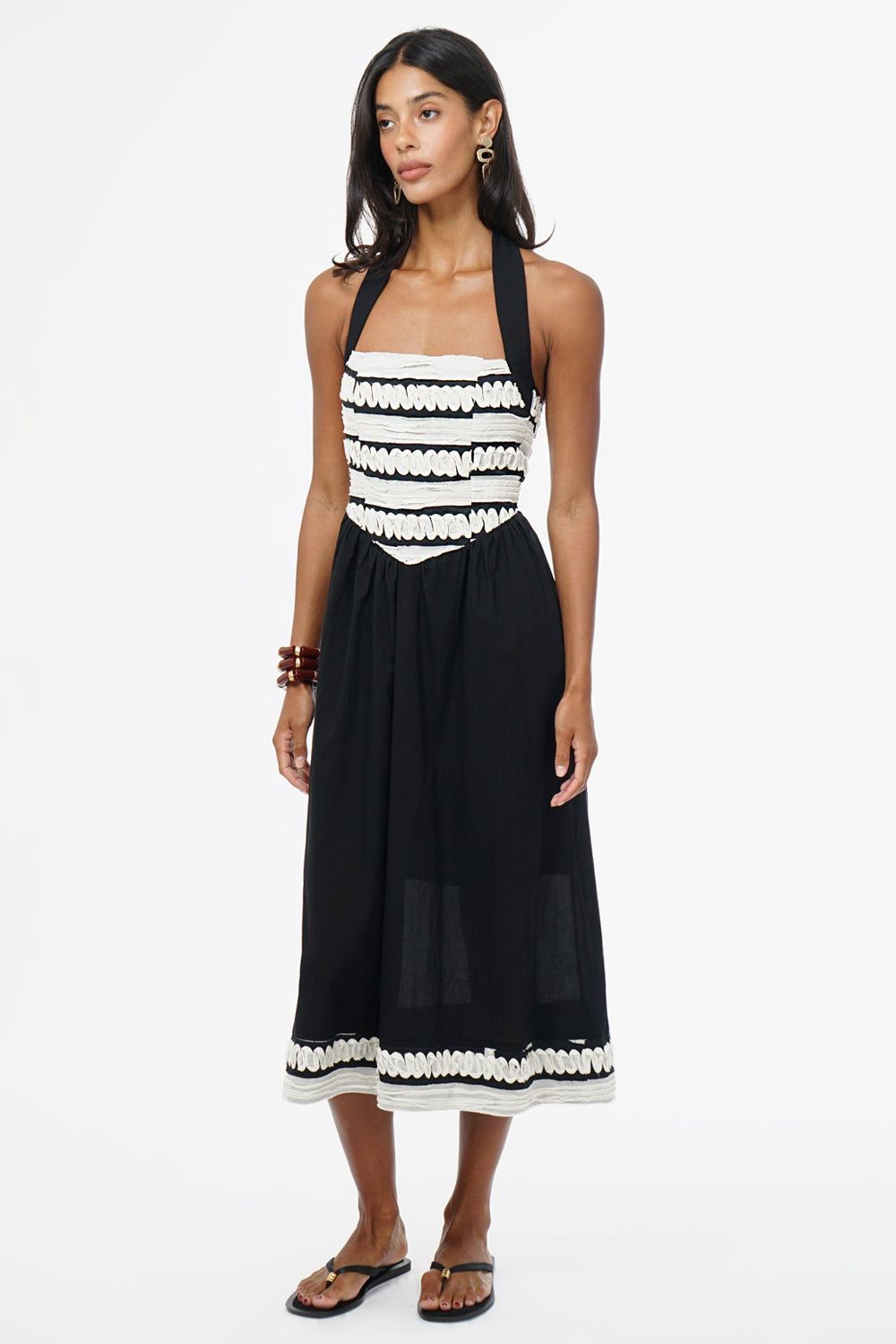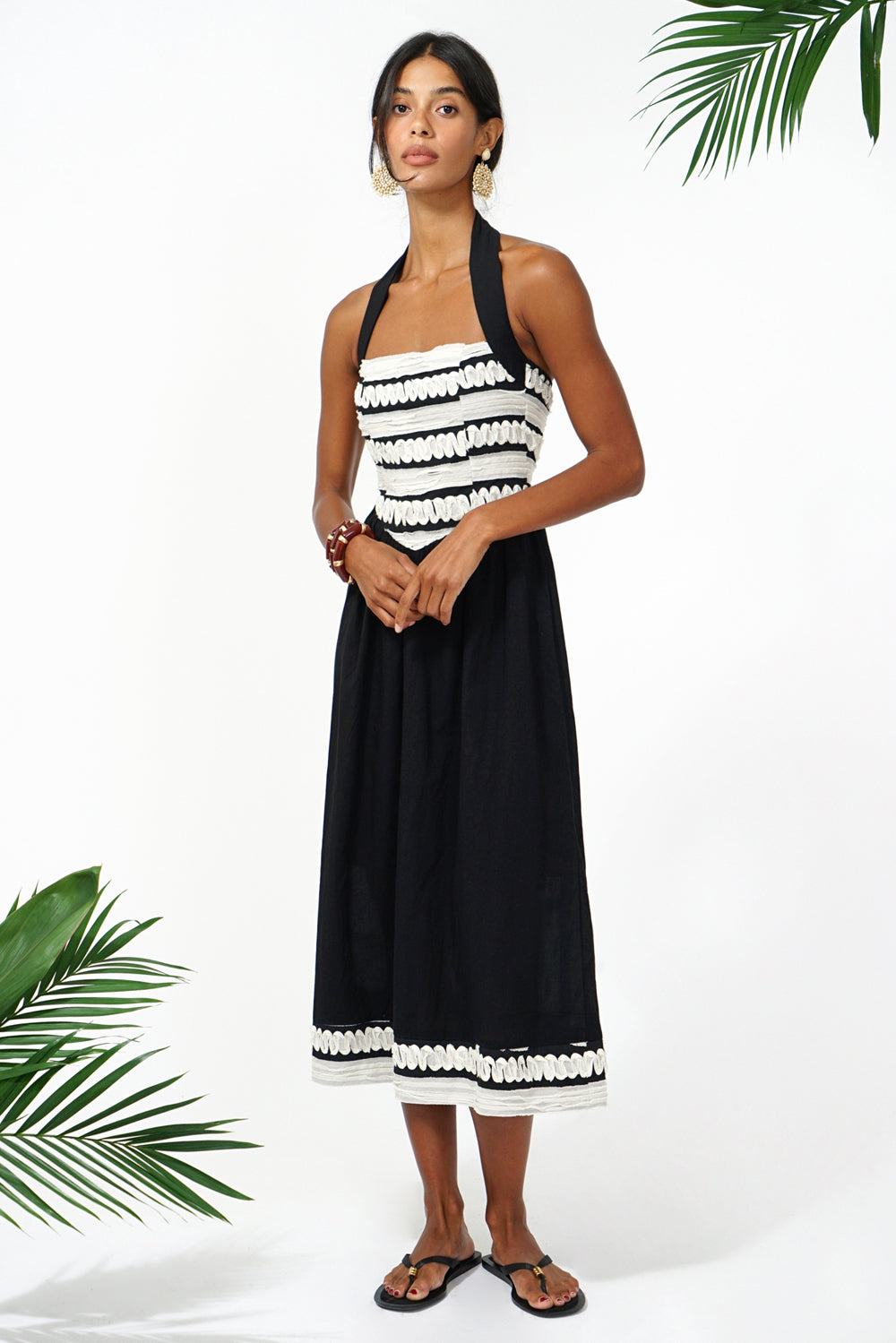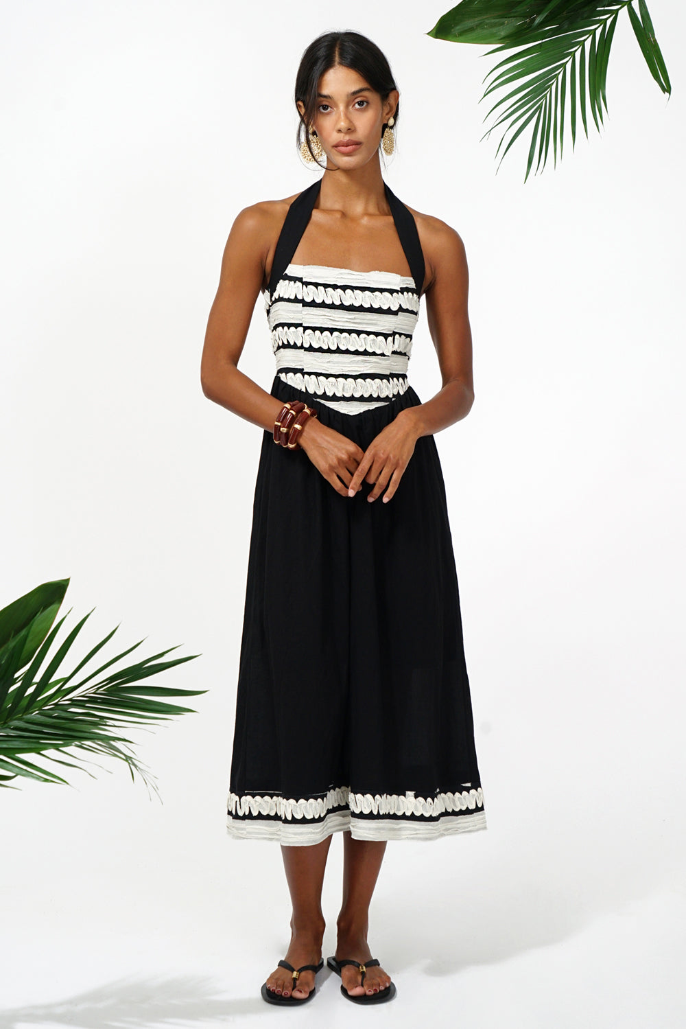 The textured ribbon bodice features bold halter straps and a flattering neckline that frames the shoulders just right. A fitted waist flows into an airy A-line skirt, finished with matching ribbon trim that ties the whole look together.