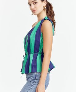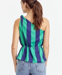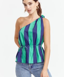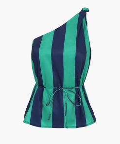 A striking blend of blue and turquoise stripes that effortlessly captures the essence of modern style. This one-shoulder top features a single strap for a chic asymmetrical look. Elevate your silhouette with a stylish string that can be tied at the waist allowing for a customizable fit and a touch of playful charm.