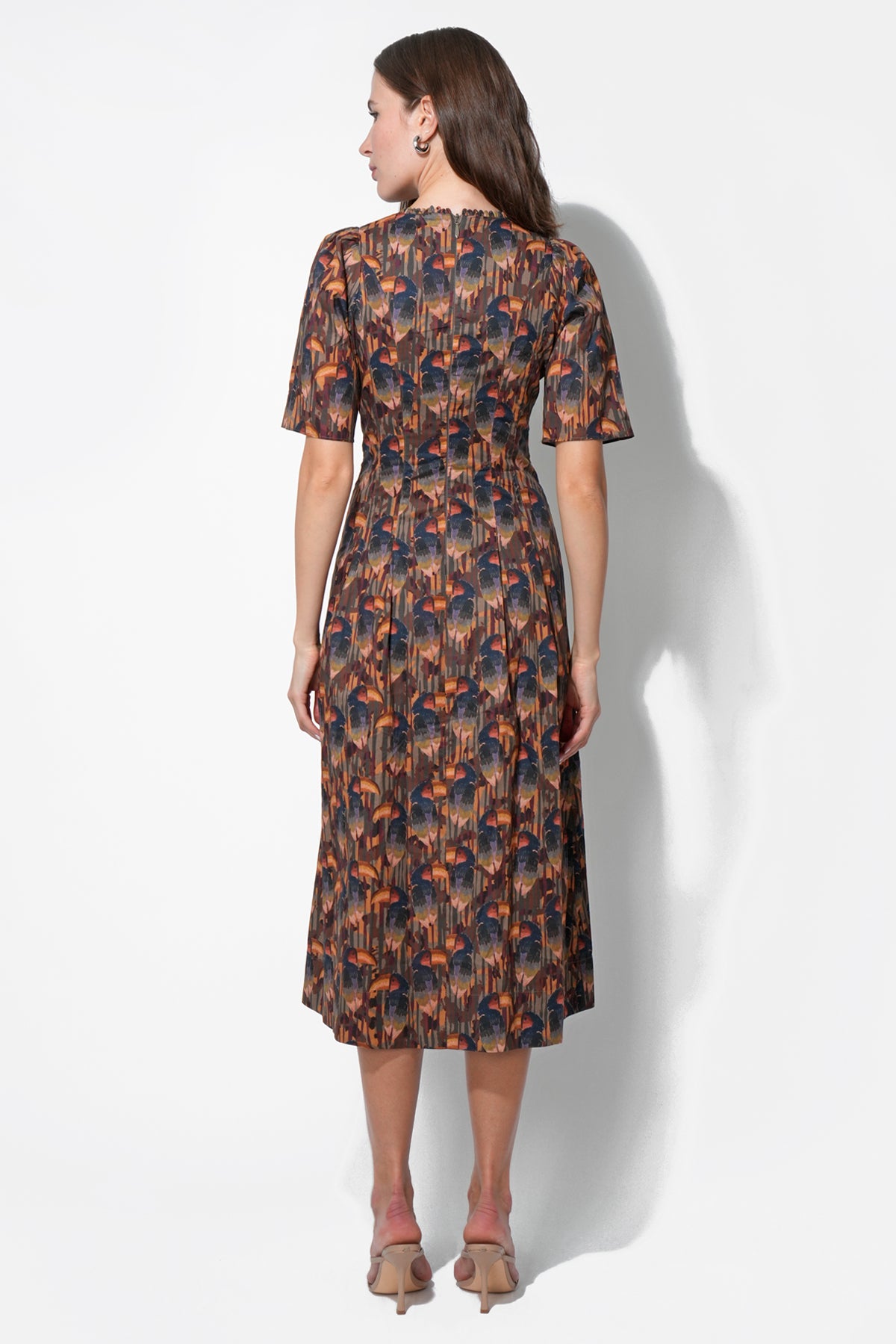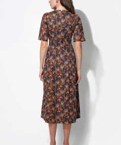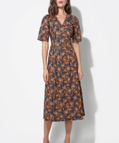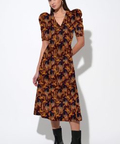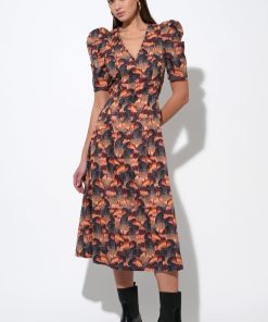This stunning midi dress, in a captivating bright pink hue with a subtle textured finish, is designed to make a statement. It features a flattering V-neckline and romantic short puff sleeves, adding a touch of feminine elegance.