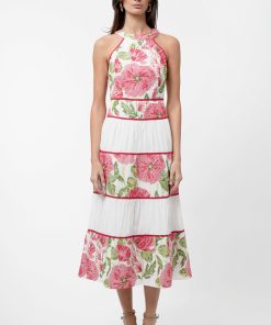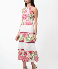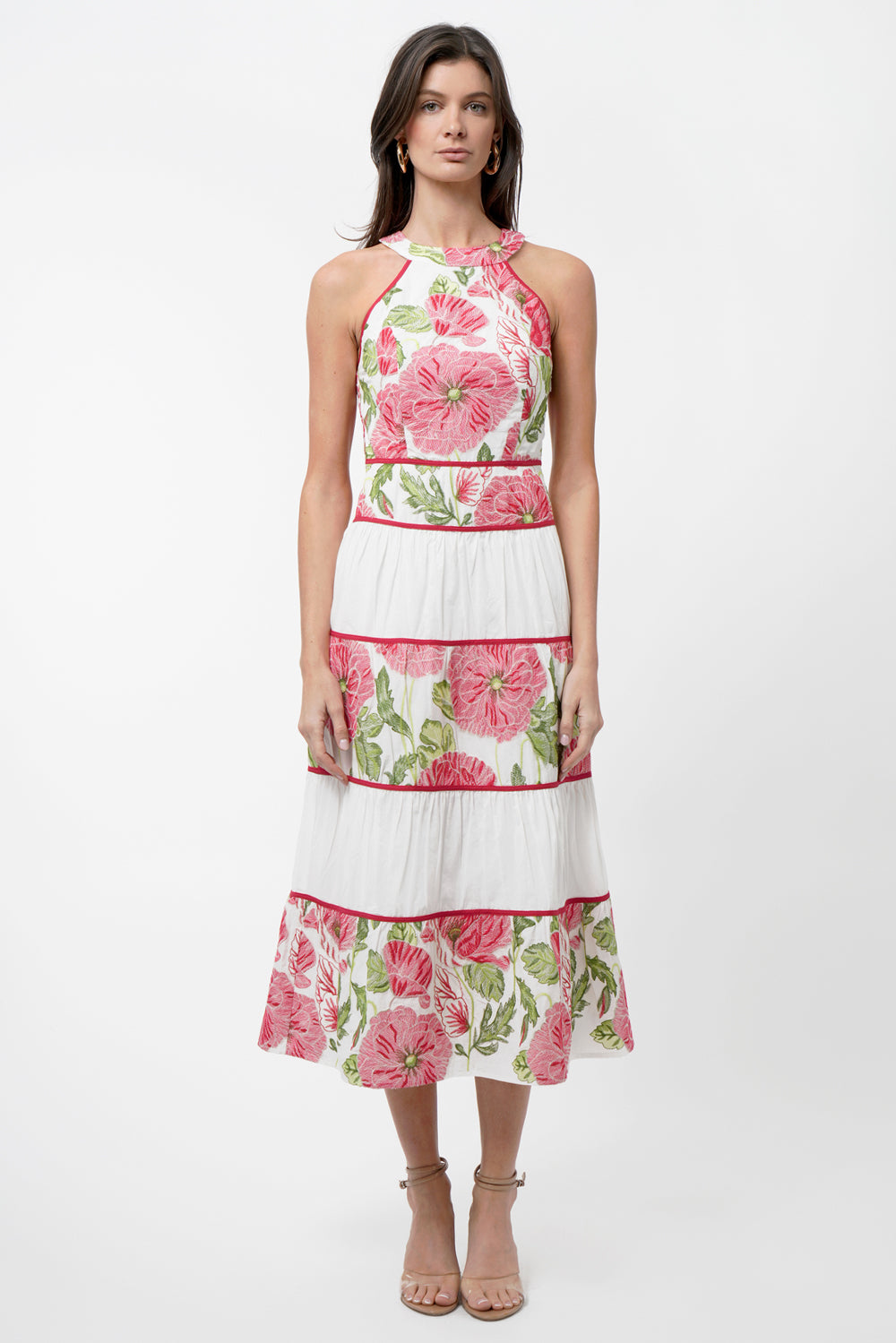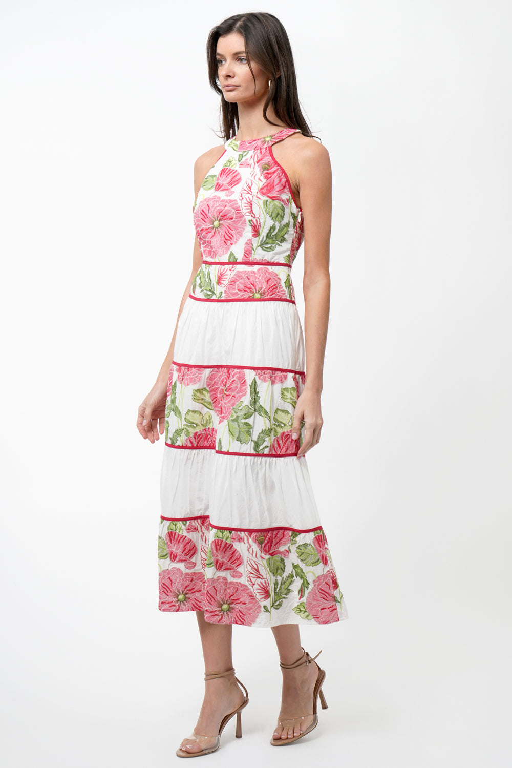 The Haven Dress stuns with vibrant floral embroidery, a flattering halter neckline, and tiered skirt panels trimmed with contrast piping for a polished finish. Designed to skim the waist and flow effortlessly into a midi length, this dress strikes the perfect balance between structure and movement.