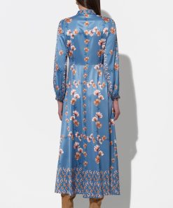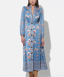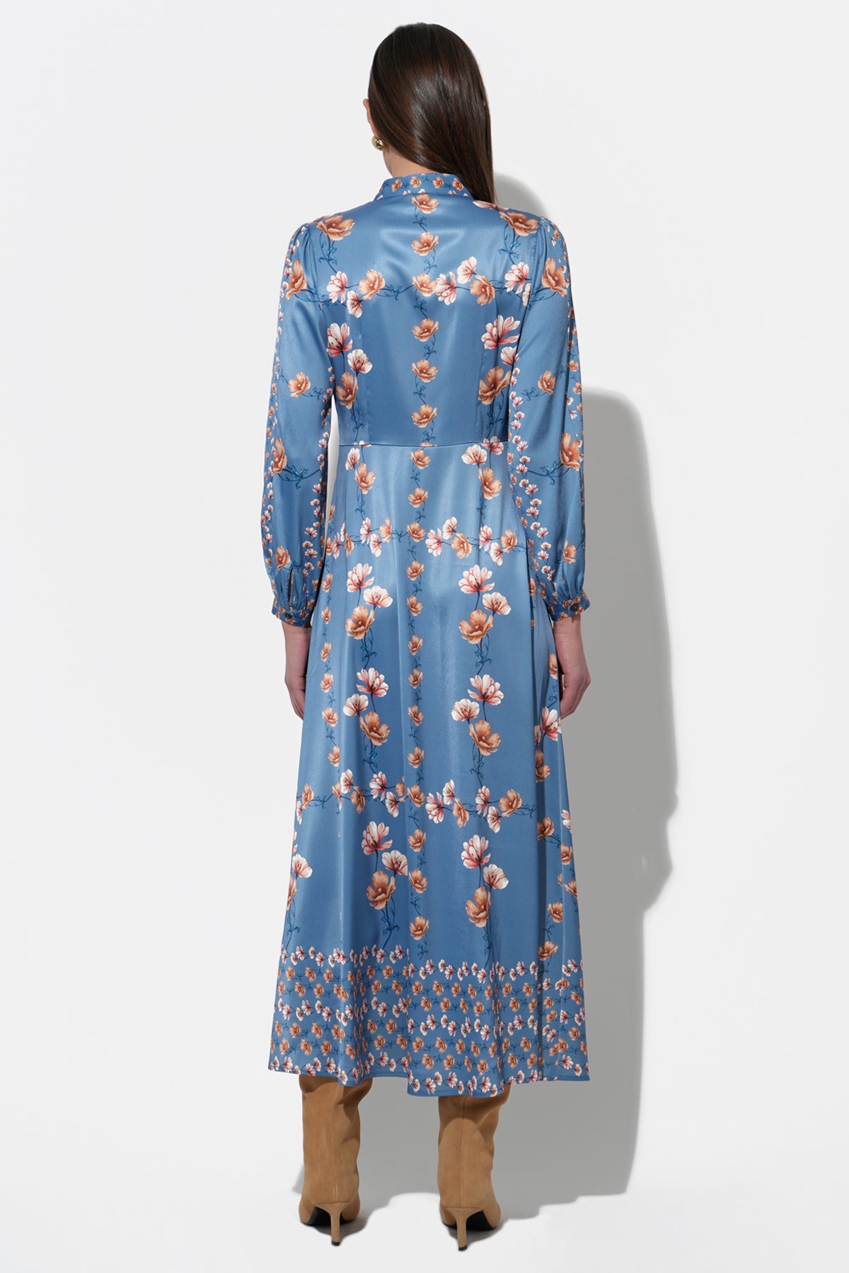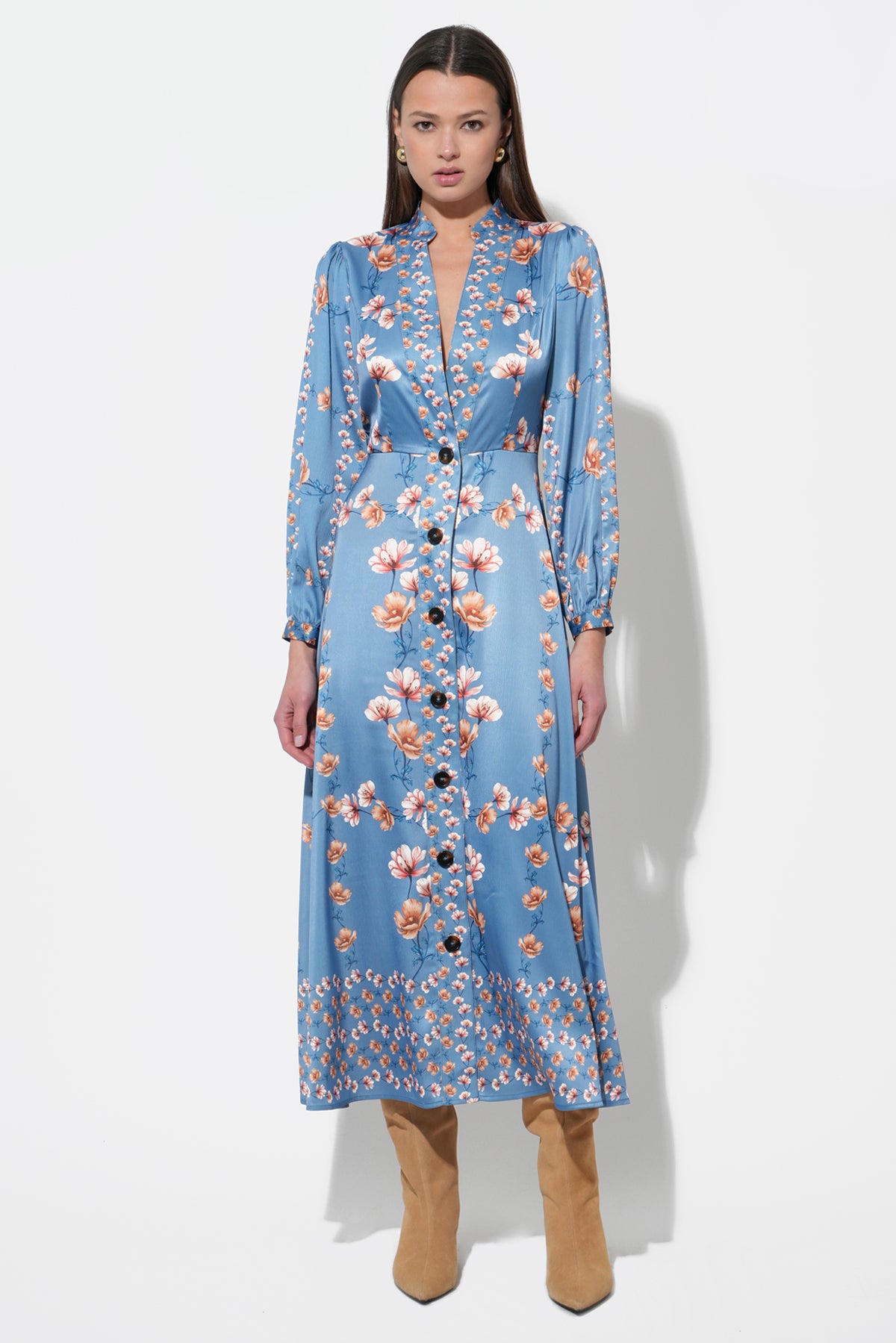 This charming midi dress, in a serene light blue hue with a subtle textured finish, offers a blend of classic design and modern comfort. It features a sophisticated V-neckline with a neat collar and a full button-front closure, allowing for versatile styling.
