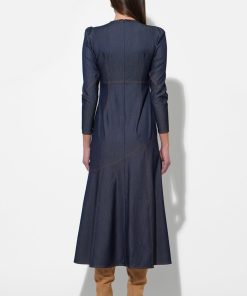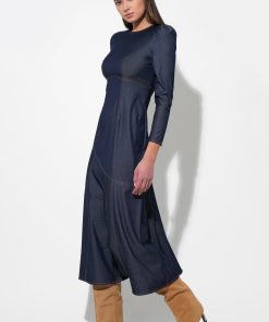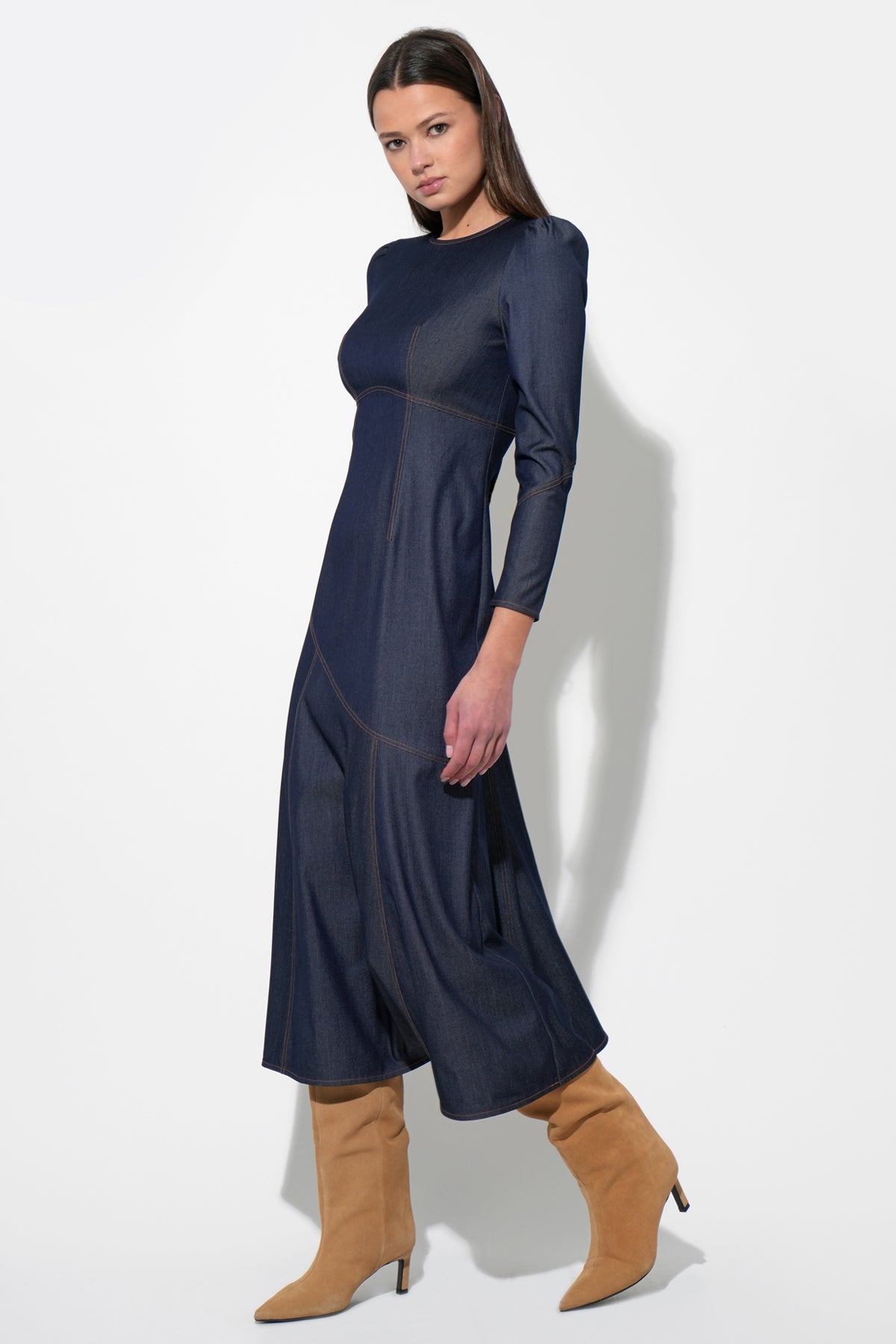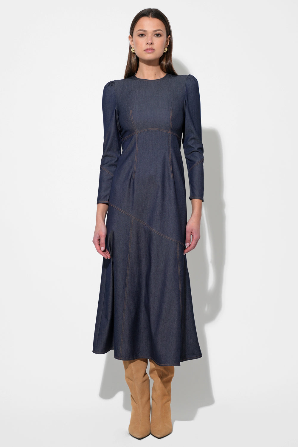 It is made from a structured denim-like fabric in a medium blue shade with contrasting stitching that highlights the dress’s architectural lines. The dress features a flattering round neckline and a midi-length A-line skirt.