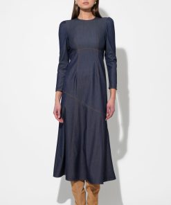 It is made from a structured denim-like fabric in a medium blue shade with contrasting stitching that highlights the dress’s architectural lines. The dress features a flattering round neckline and a midi-length A-line skirt.