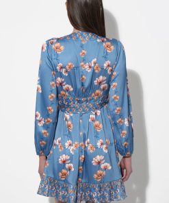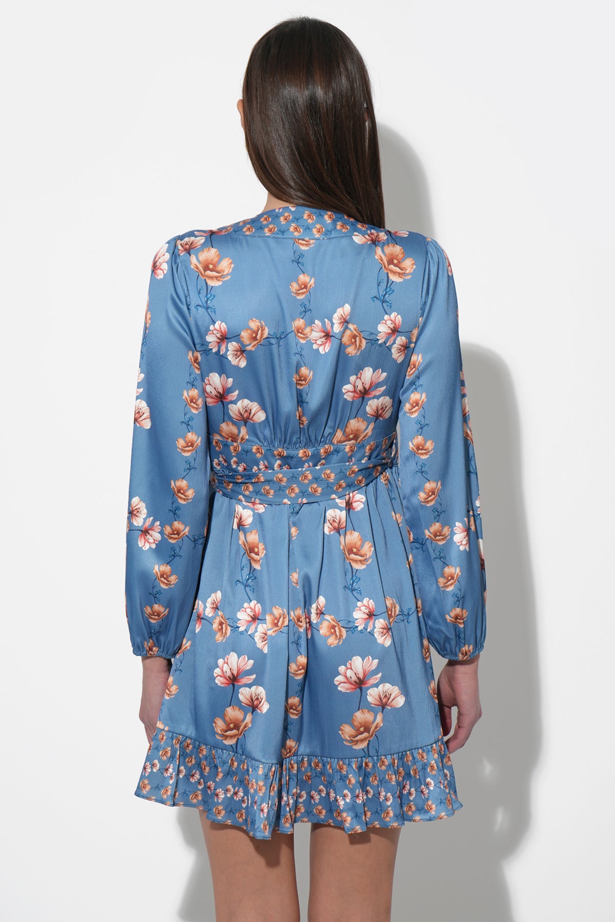 This delightful mini dress captivates with its vibrant blue hue and a charming floral or abstract print, adding a playful pop of color to your wardrobe. It features a universally flattering true wrap silhouette, complete with a graceful V-neckline and elegant short sleeves adorned with delicate ruffle details.