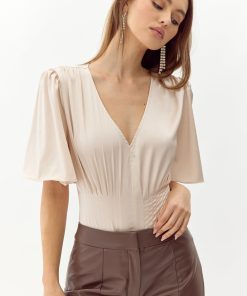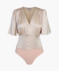The pintucked bodysuit features short, flutter sleeves and a flattering V-neckline. Wear with a midi skirt for a full elegant look or let it add class to any pair of trousers or pants.