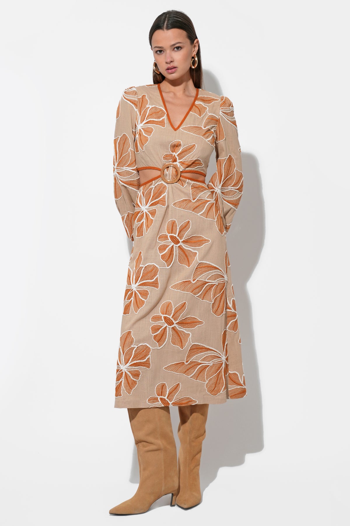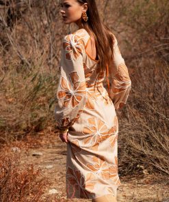 This stunning maxi dress, in a fresh white or cream hue, is adorned with delicate embroidery across the bodice and throughout the design, adding an artisanal touch. It features a flattering V-neckline and stylish puff sleeves with comfortable elasticated cuffs.
