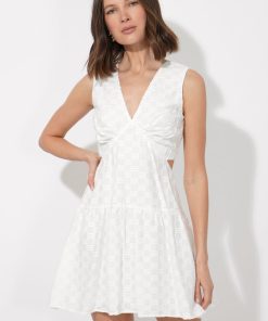 Cue the compliments—the Junia Mini Dress is here to steal the spotlight. Designed with a textured grid jacquard and subtle cutouts at the waist, this flirty mini balances playful details with modern polish. The deep V-neckline and softly gathered bust add a touch of romance, while the flared skirt gives you that twirl-worthy moment.