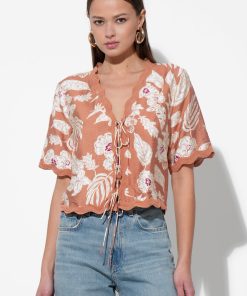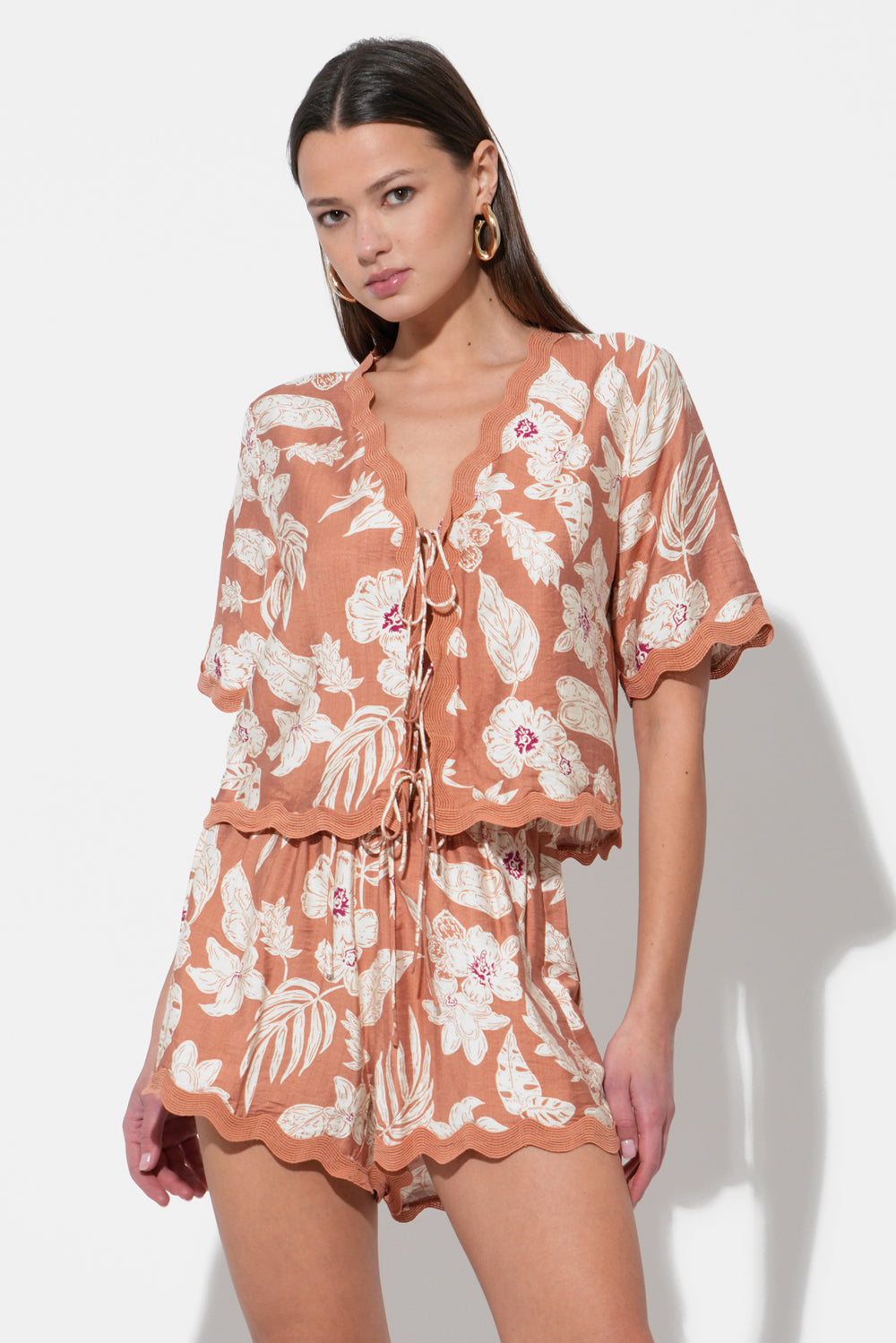 This charming top features a warm, earthy tone adorned with an elegant floral and botanical print in white and subtle pops of purple. The relaxed silhouette is enhanced by wide, flowy sleeves and a distinctive scalloped trim along the V-neckline and hem. Playful mini front ties add a touch of adjustable style, allowing for a personalized fit.