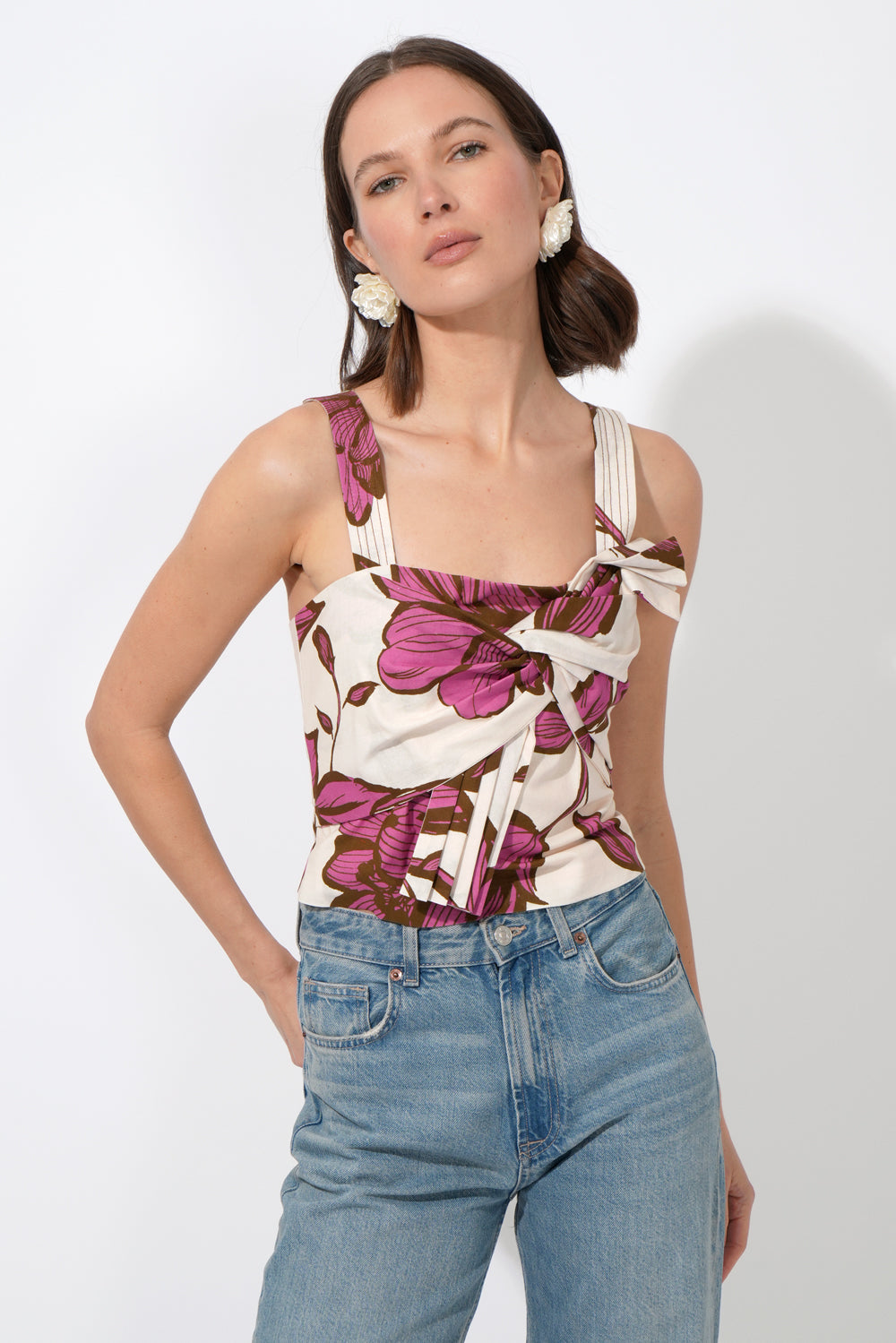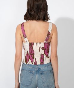 This floral crop top showcases a twisted bodice with pleated details. The adjustable straps are adorned with parallel stitching and the back is installed with a smocked panel.