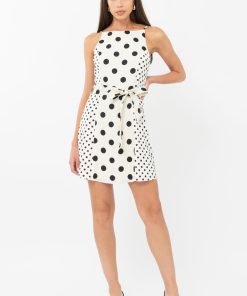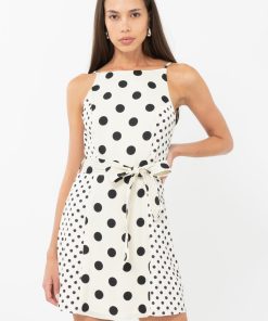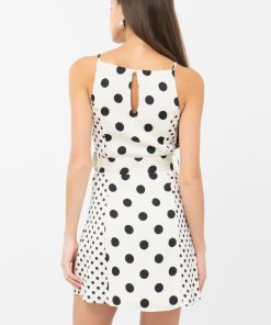 Sleeveless mini dress featuring a tie waist belt. The polka dot pattern is contrasted with smaller dots on the sides. Finished with a keyhole button in the back.
