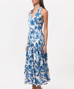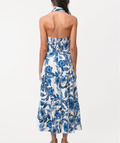 Romantic, refined, and ready for the spotlight. The Lenni Dress features a bold blue floral print on a crisp ivory base, cut in a breezy halter silhouette that sculpts the bodice and flows into a tiered midi skirt. The open back adds just the right touch of allure, balanced by a polished collar neckline and soft, breathable fabric.