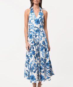 Romantic, refined, and ready for the spotlight. The Lenni Dress features a bold blue floral print on a crisp ivory base, cut in a breezy halter silhouette that sculpts the bodice and flows into a tiered midi skirt. The open back adds just the right touch of allure, balanced by a polished collar neckline and soft, breathable fabric.
