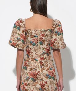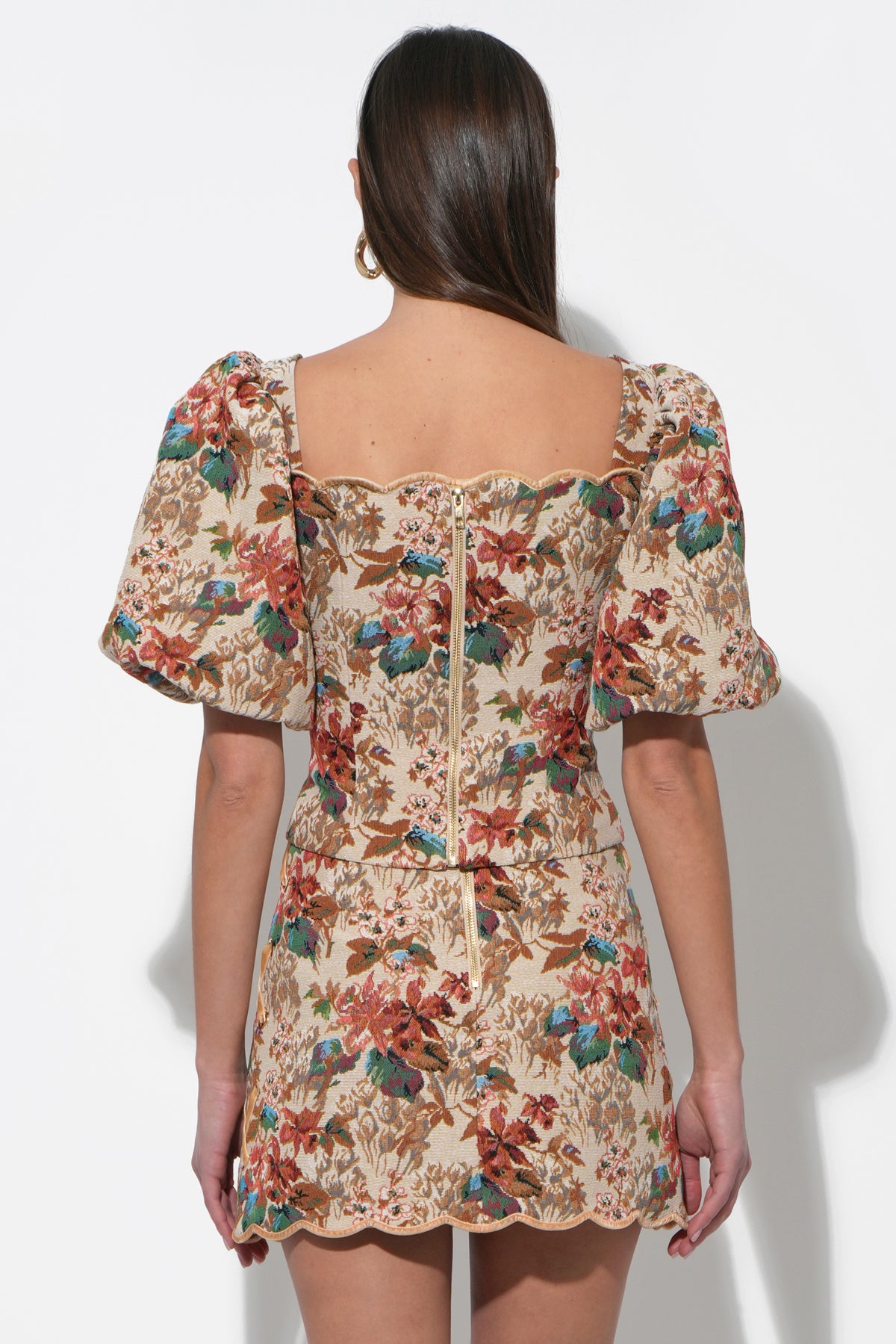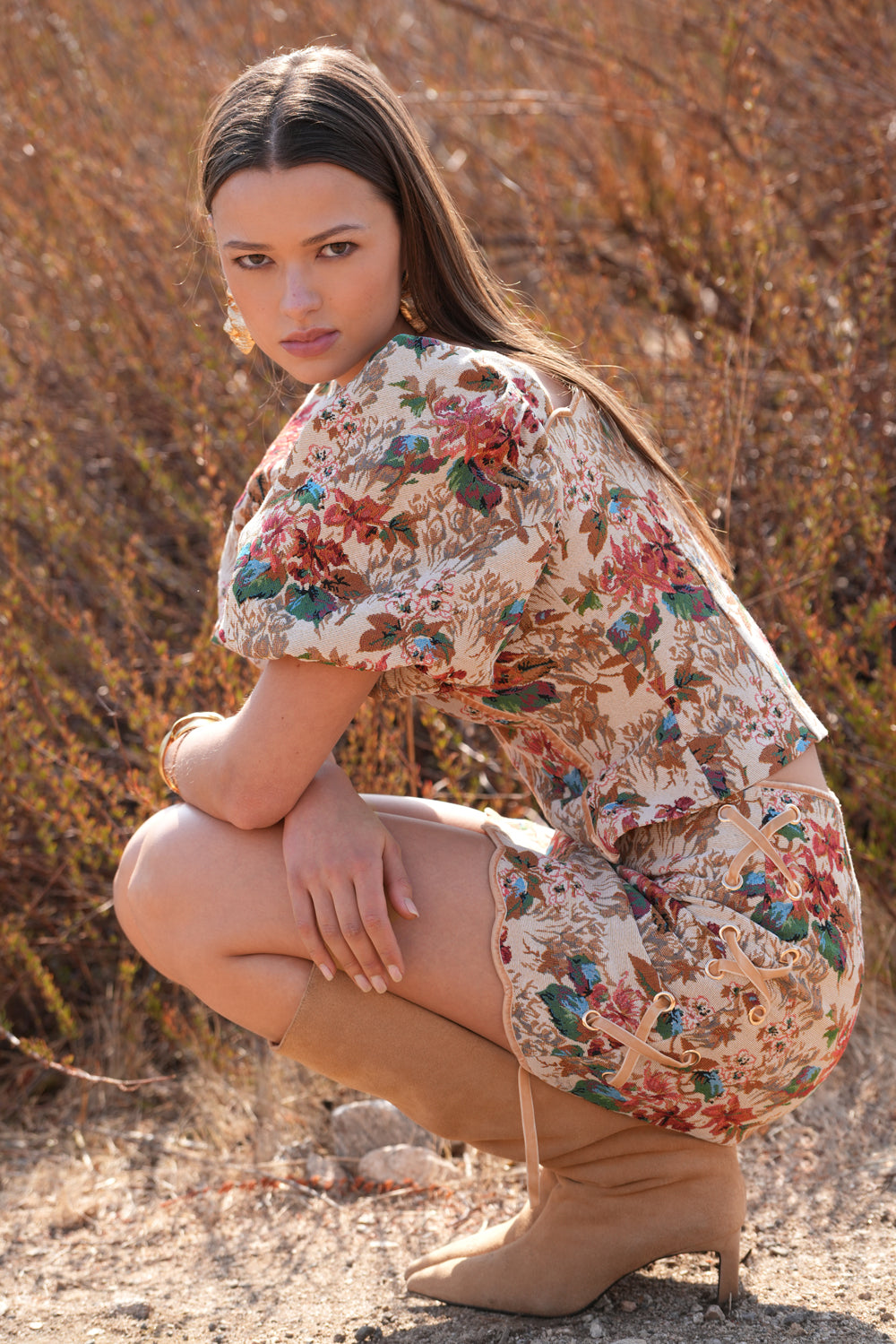 This captivating mini skirt showcases a rich, multi-colored tapestry-inspired print, blending hues of blue, orange, and cream for a unique and vibrant appeal. It features a stylish lace-up detail at the front, adding an edgy yet feminine touch, and is designed with a flattering fitted silhouette.