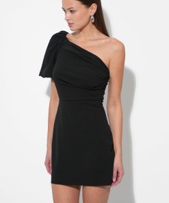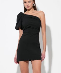 Crafted from a comfortable and flattering stretch fabrication, this dress is designed to hug the curves while allowing for ease of movement. Its standout feature is the chic one-shoulder neckline, elegantly showcasing one shoulder while the other is adorned with a dramatic puff sleeve.
