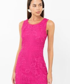 Sleeveless, lace dress with a floral pattern. Rendered in a deep pink, the garment falls to a short length and show’s off a classy structure that’s suitable for most special occasions.