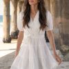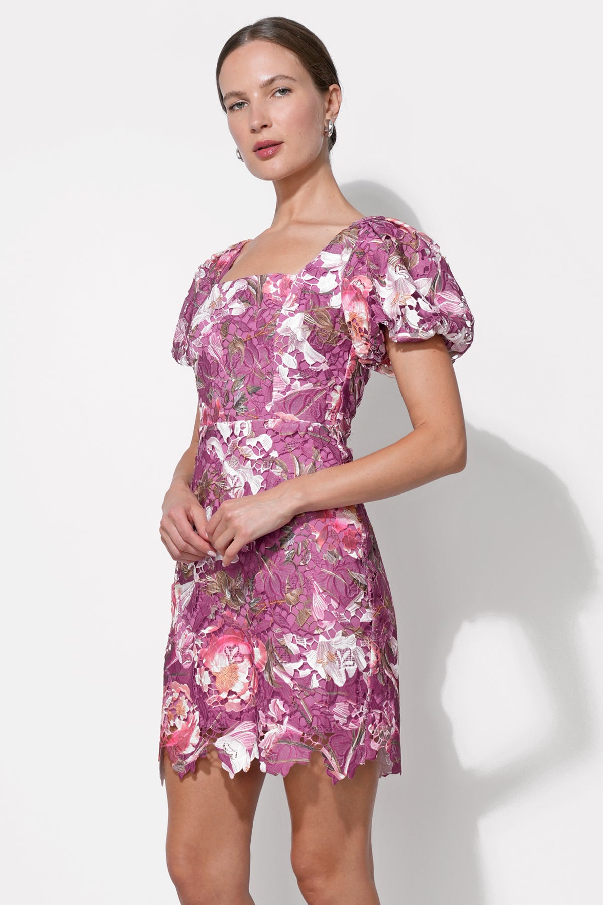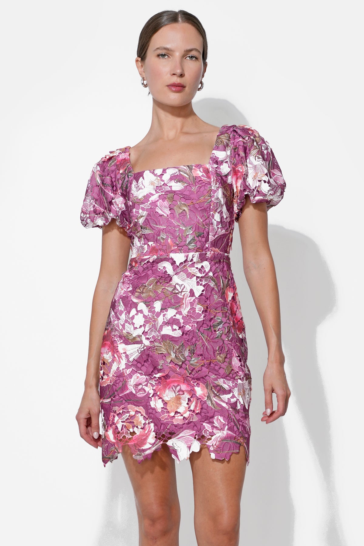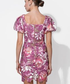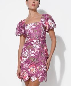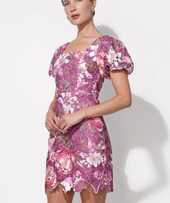 This captivating mini dress, in a vibrant magenta hue, is a perfect blend of feminine charm and modern elegance. It features a stunning floral lace overlay, a delicate sweetheart neckline, and charming puff sleeves. The dress’s tiered skirt, adorned with ruffled details, creates beautiful movement, while the fitted bodice ensures a flattering silhouette.