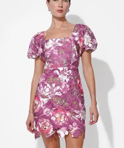 This captivating mini dress, in a vibrant magenta hue, is a perfect blend of feminine charm and modern elegance. It features a stunning floral lace overlay, a delicate sweetheart neckline, and charming puff sleeves. The dress’s tiered skirt, adorned with ruffled details, creates beautiful movement, while the fitted bodice ensures a flattering silhouette.