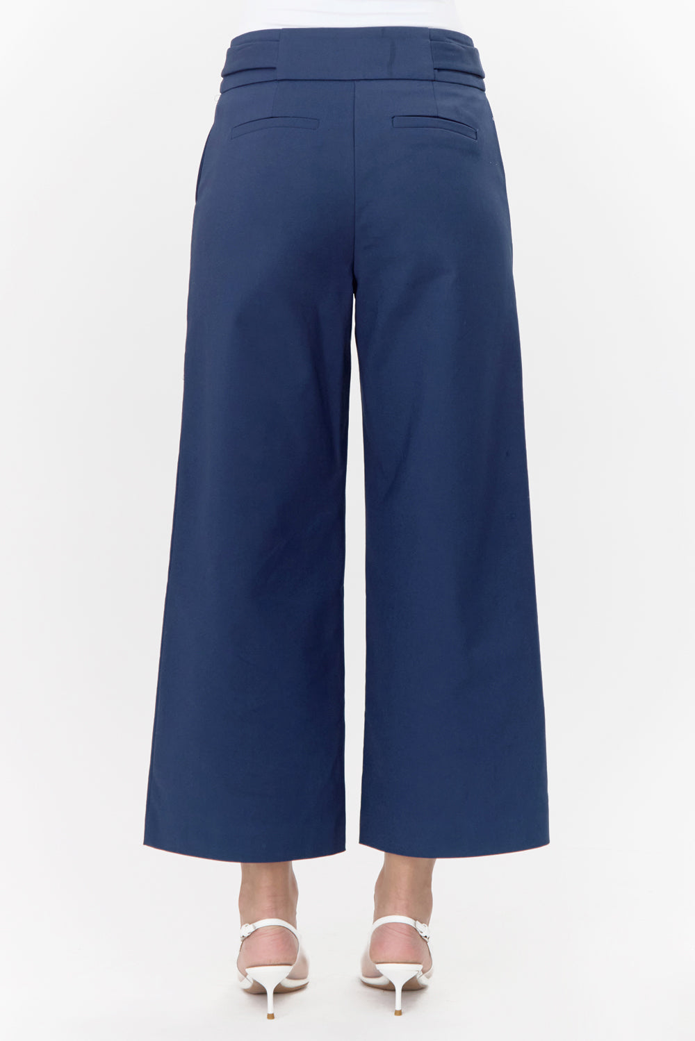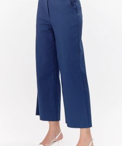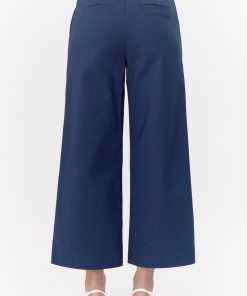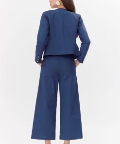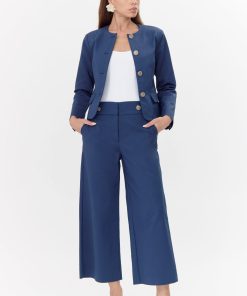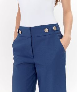 Wide-leg pants rendered in navy. The trousers features gold buttons on the side and front pockets.