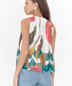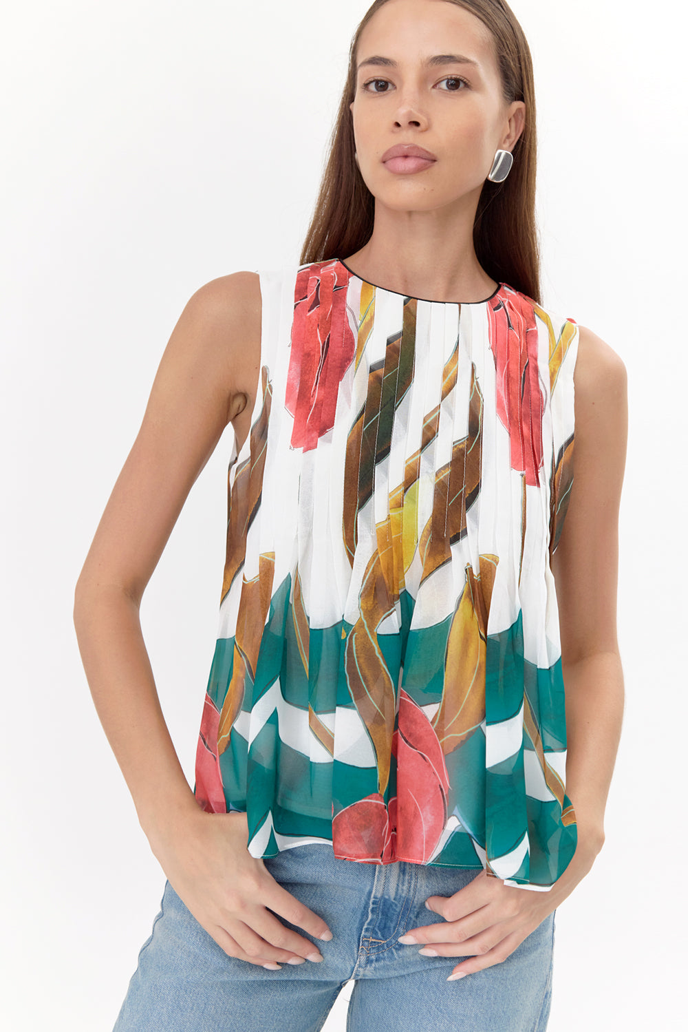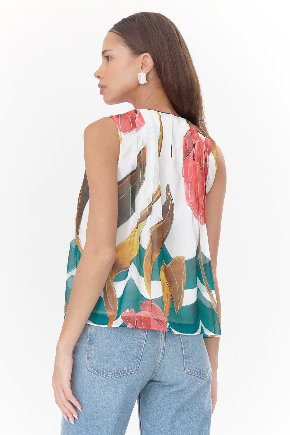 Sleeveless floral blouse featuring a scallop hem and a buttoned closure in the back. The fabric is pleated for extra texture. Style casually or elegantly.