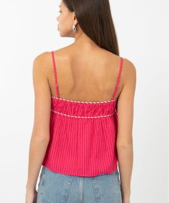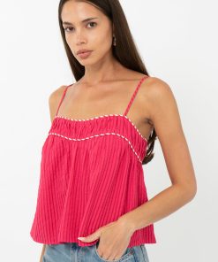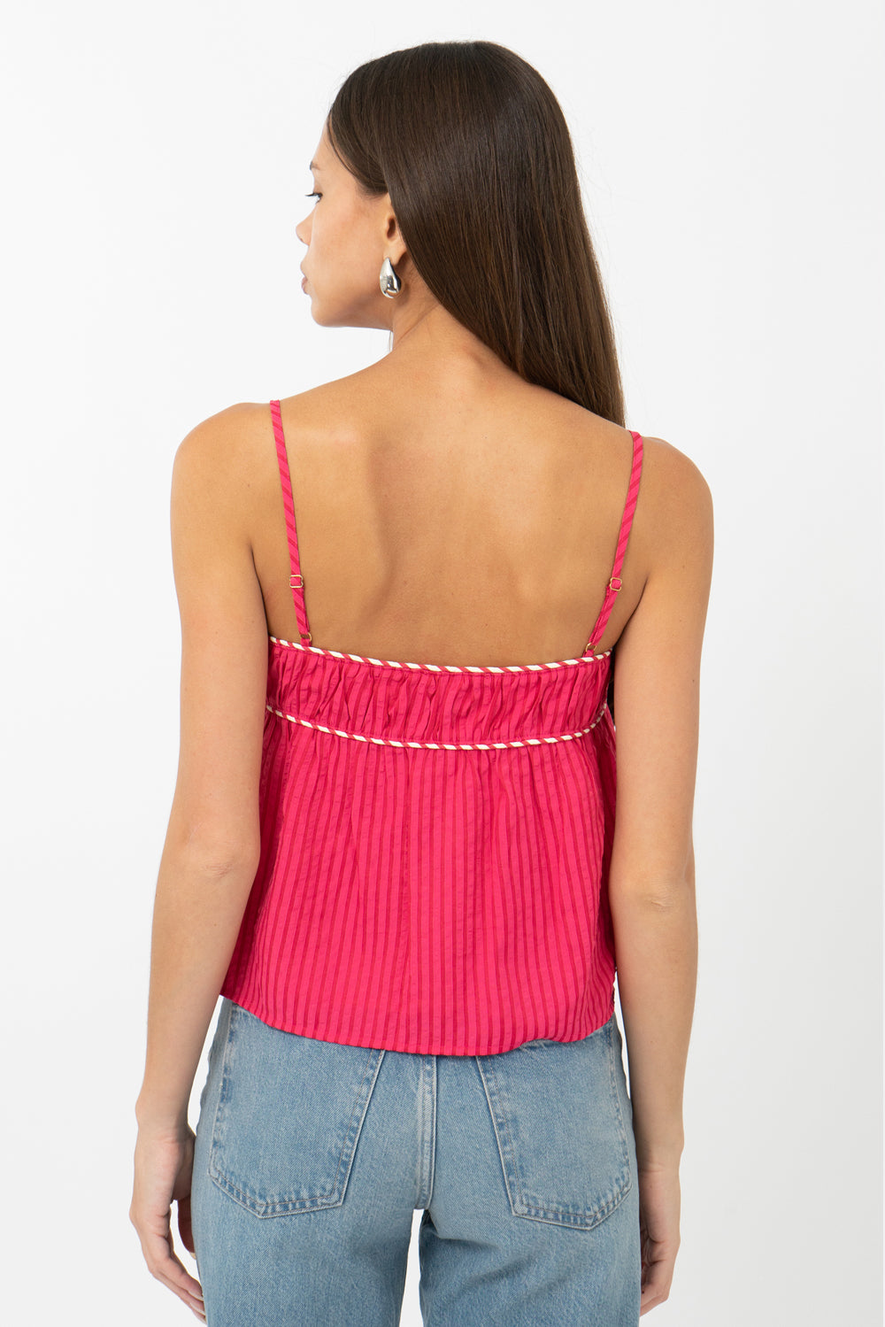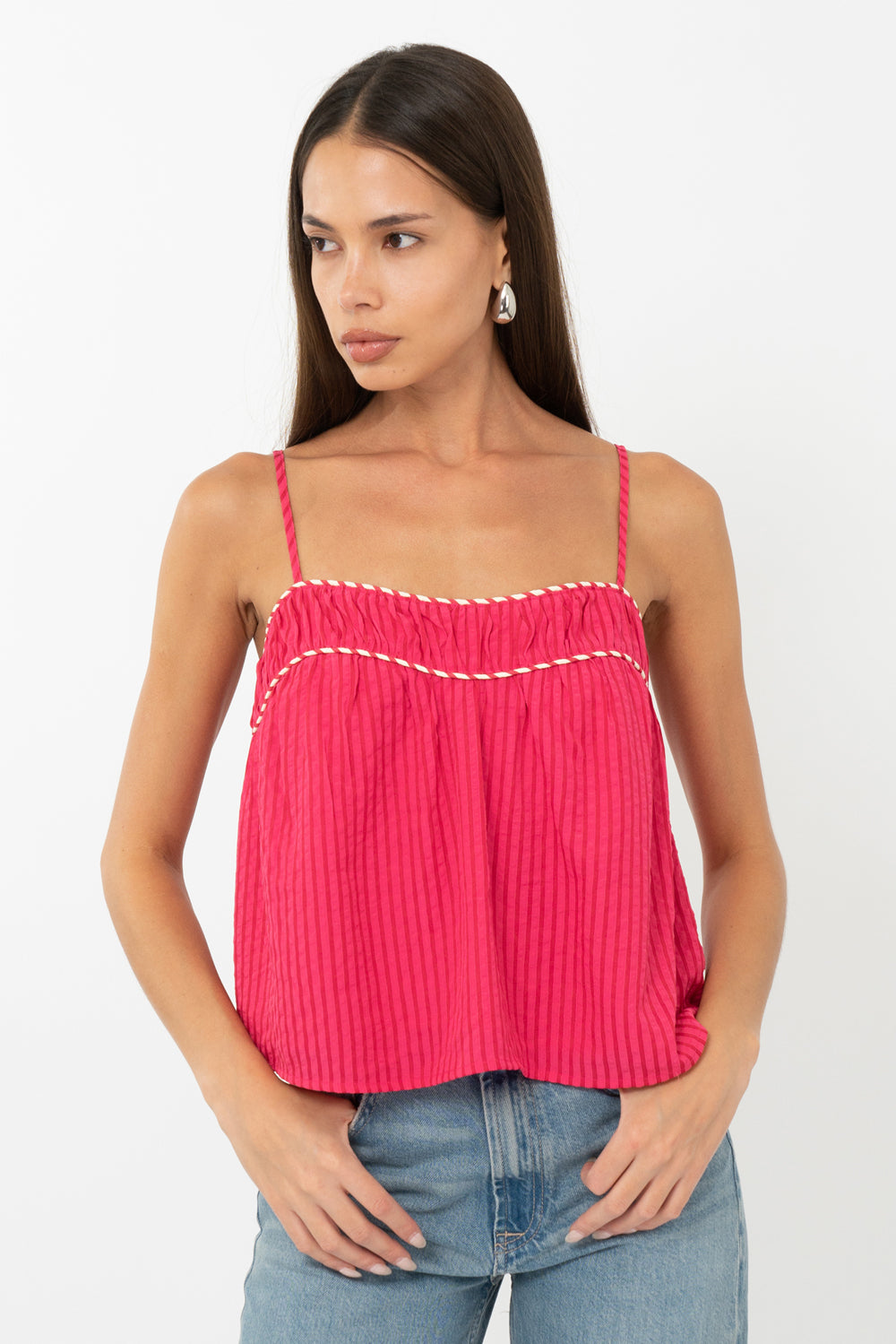 Striped tank top featuring a smocked neckline with contrast piping. The piece s finished with adjustable, spaghetti straps.