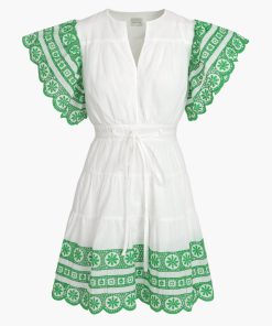 Meet your sunshine-ready stunner. The Isla Dress is a white mini with bold green embroidery and eye-catching scalloped trim on the sleeves and hem. The flutter sleeves bring the drama, while the adjustable tie waist gives you that effortless cinch. Made from lightweight cotton, it’s breezy, flattering, and fun.