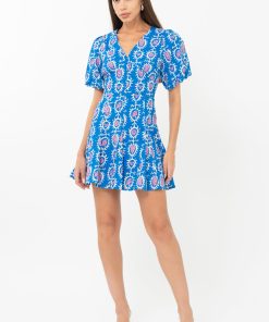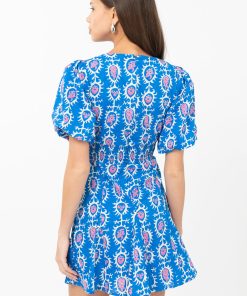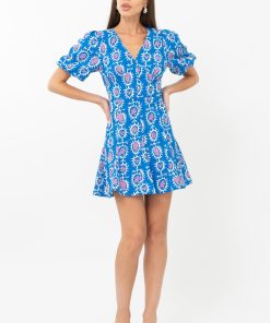 Blue printed mini dress featuring puffed short-sleeves and a V-neckline. Installed with back zipper.