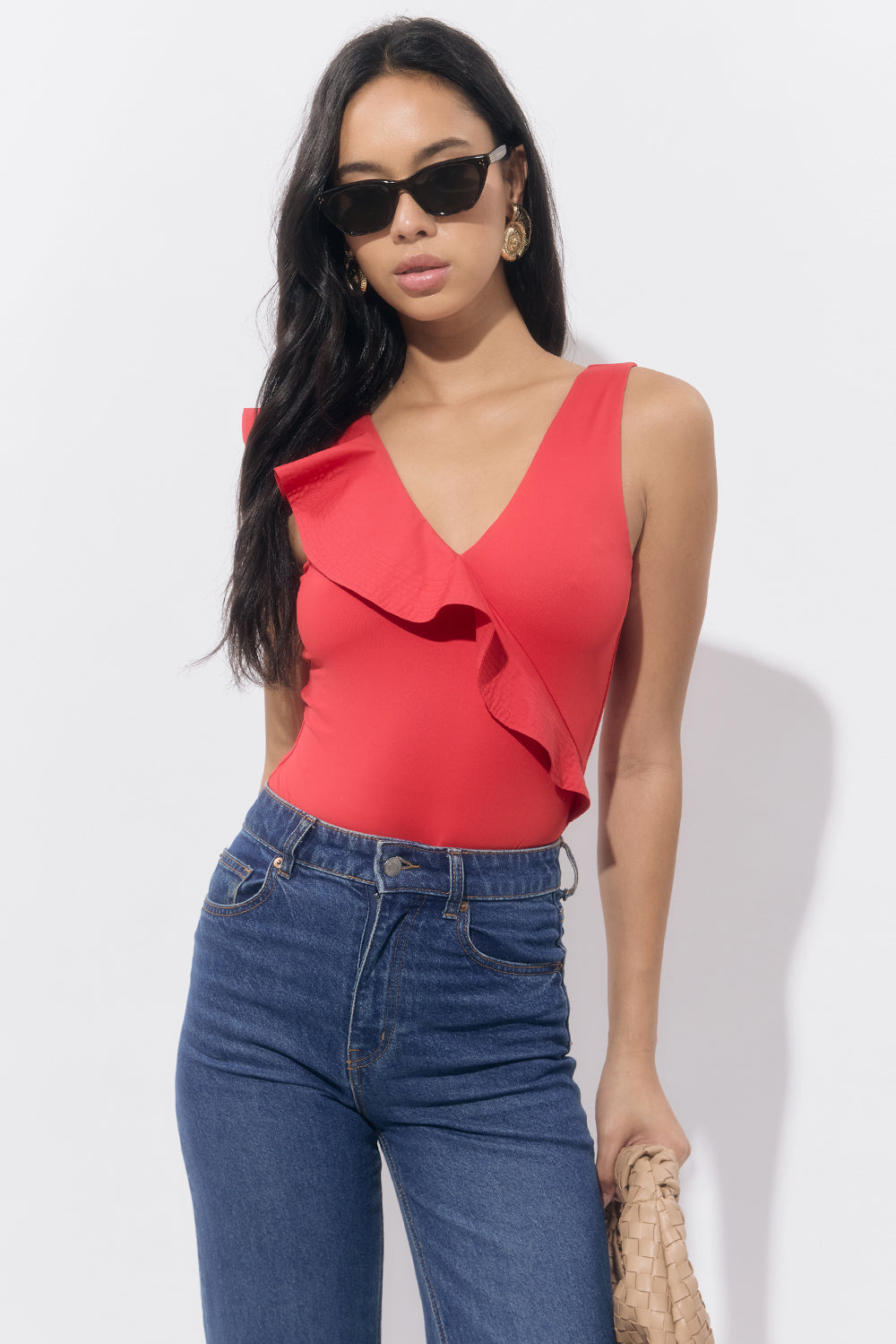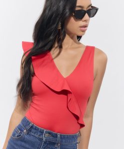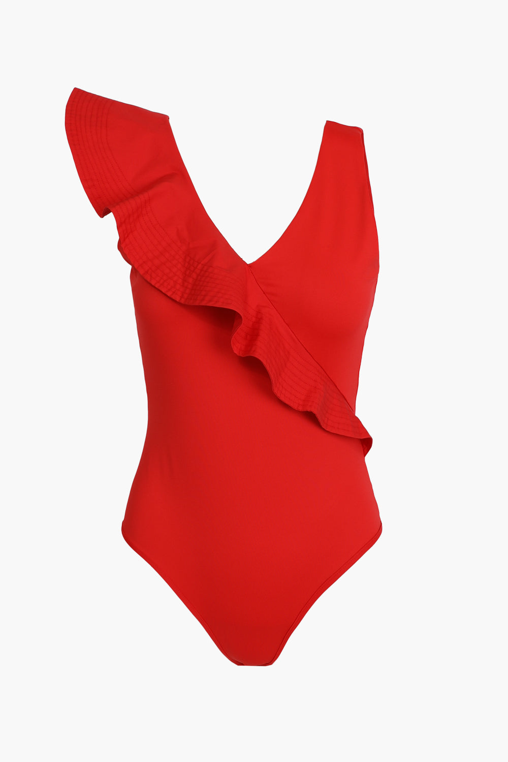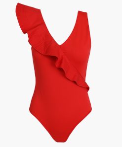 The asymmetrical ruffle detail adds playful movement, while the V-neckline and clean silhouette keep it effortlessly flattering. Designed in a vibrant red, this suit brings confident energy whether you’re beach-bound or headed to a weekend getaway.