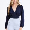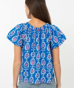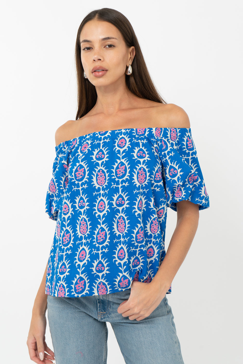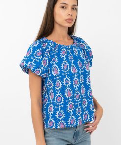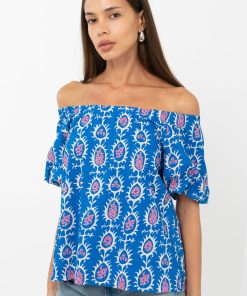 Blue top rendered in a pink and white print. The garment features an elasticated neckline that can be styled as an off shoulder piece.