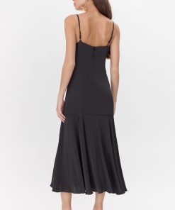 This midi slip dress adorns a flared hem and V-neckline. Designed with adjustable straps and a back zipper for easy wear.