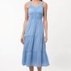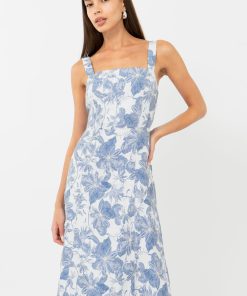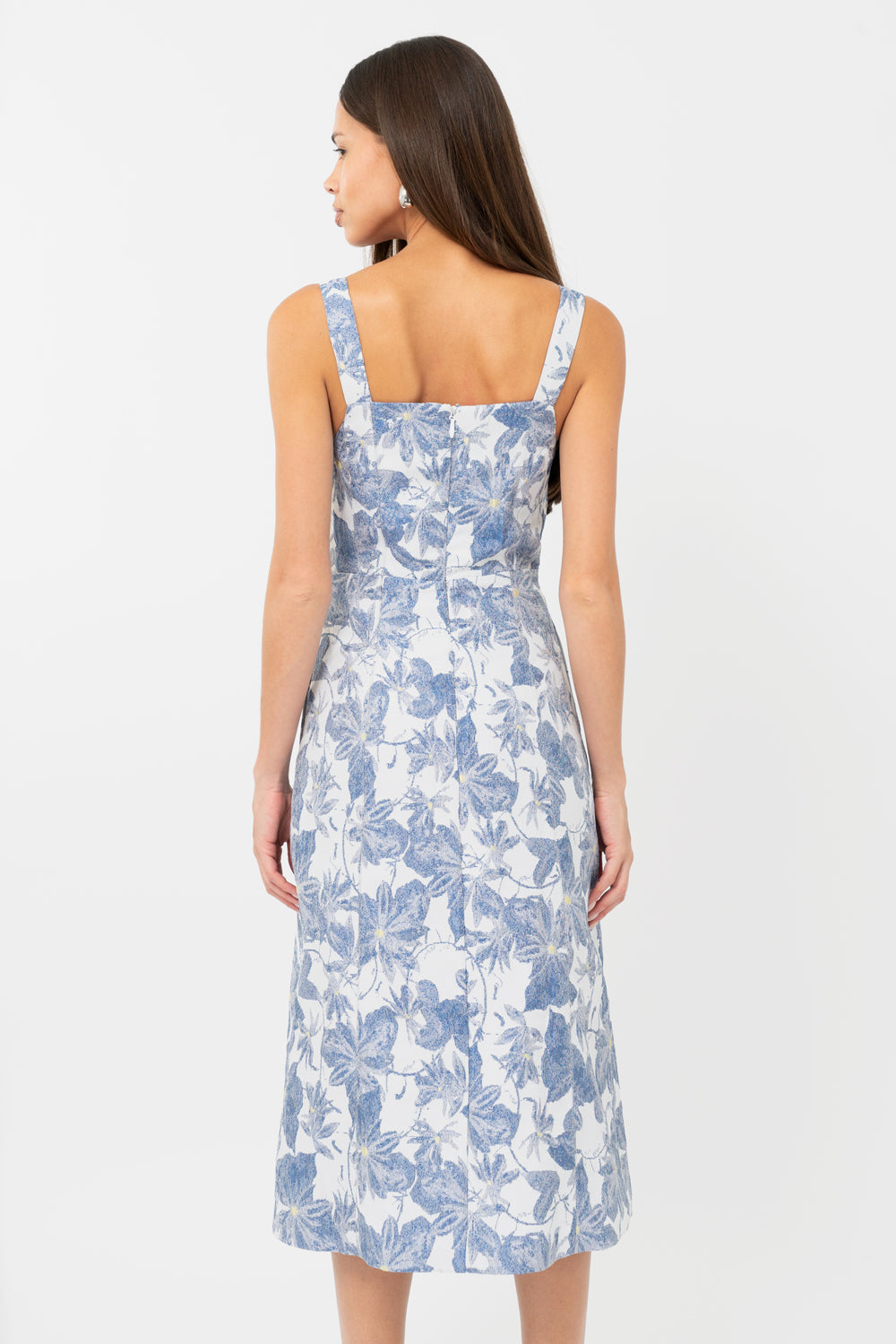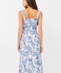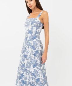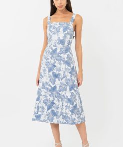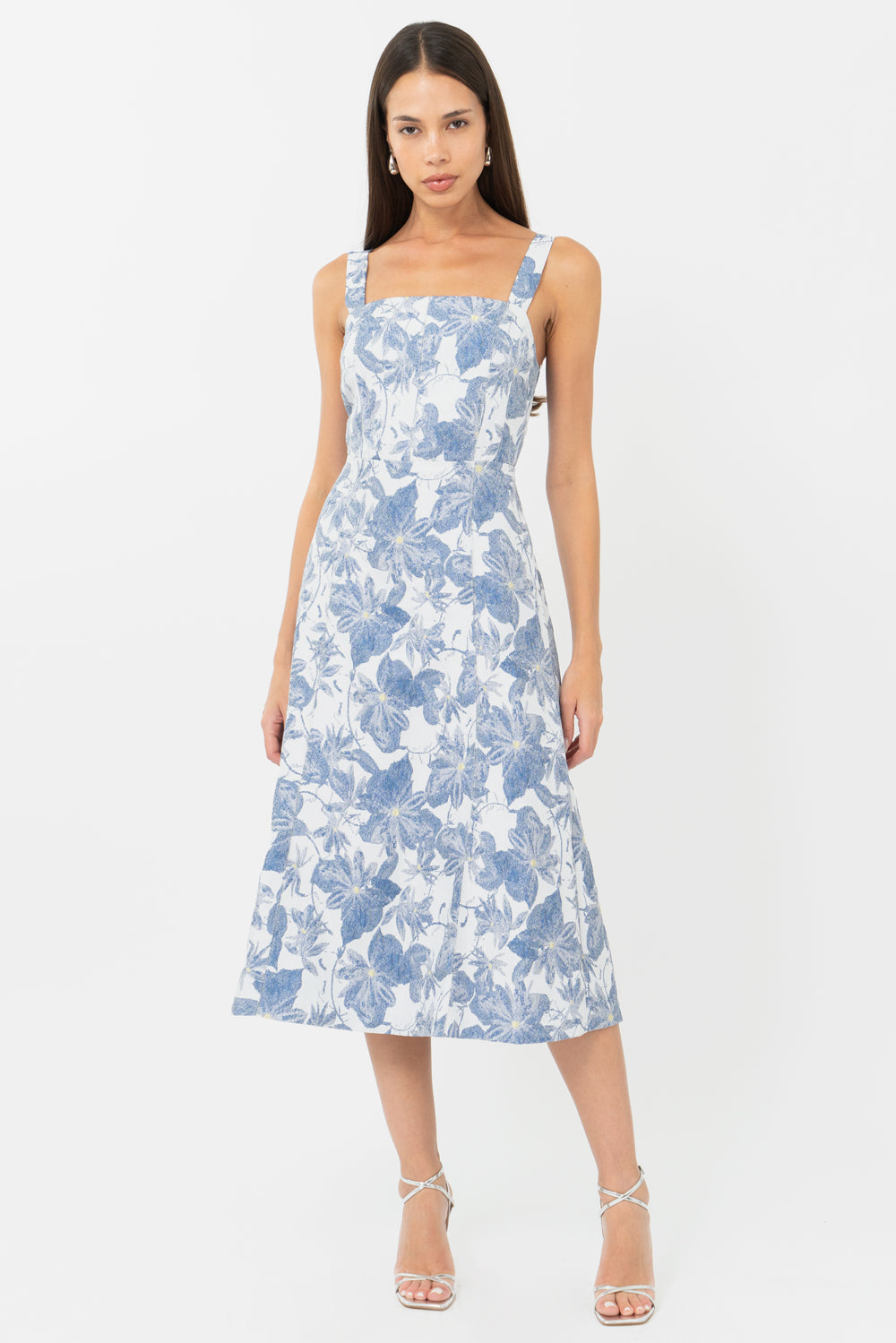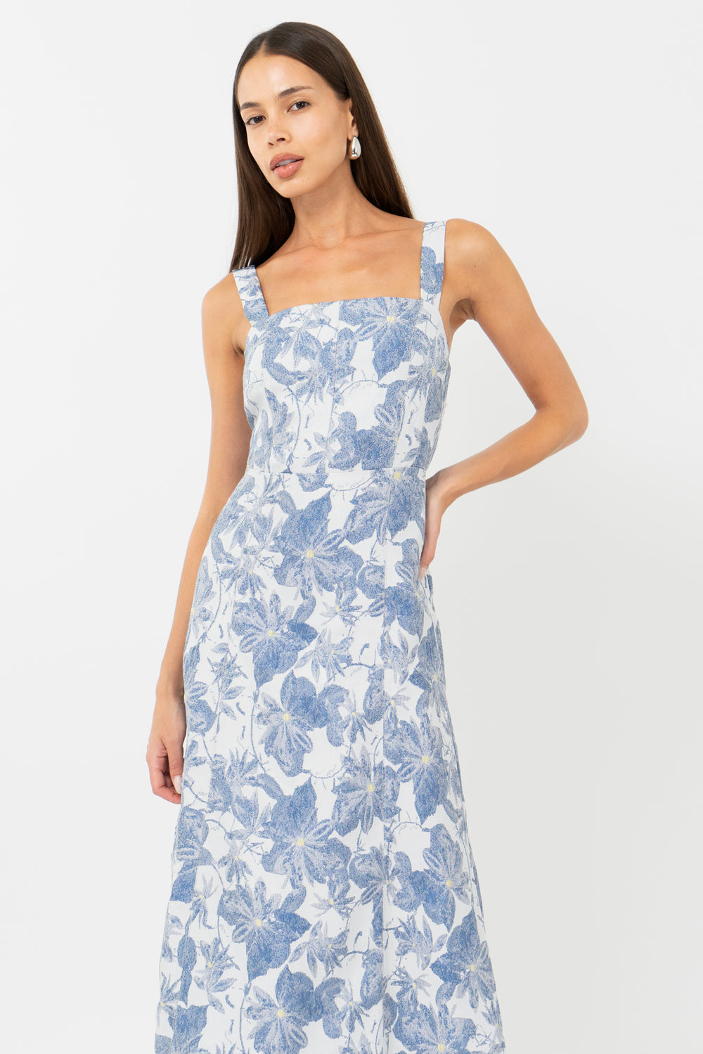 This strappy midi is imagined in a floral jacquard. The dress is installed with a square neckline and back zipper.