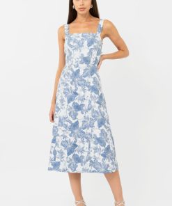 This strappy midi is imagined in a floral jacquard. The dress is installed with a square neckline and back zipper.