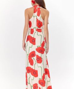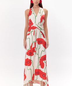 Effortlessly elegant with a touch of drama, the Rosalyn Dress is designed for the modern romantic. Adorned with a striking red floral print, this flowy maxi dress features a halter neckline that frames the shoulders beautifully. The crossover bodice cinches at the waist, creating a flattering silhouette, while the front slit adds graceful movement.