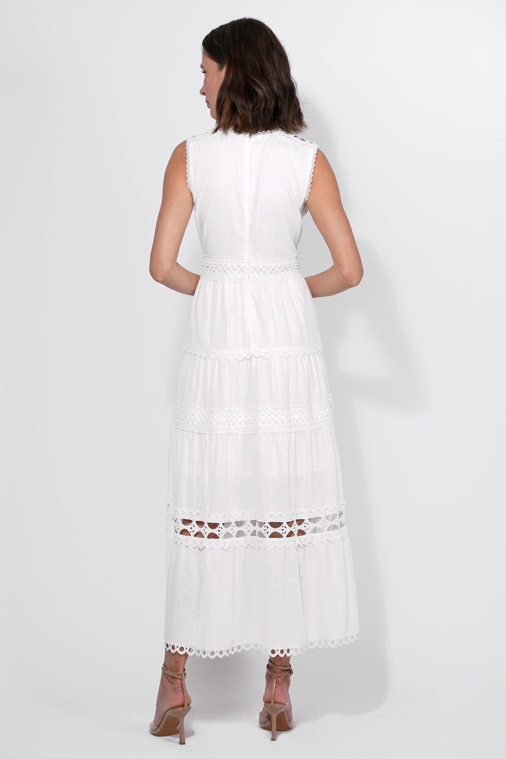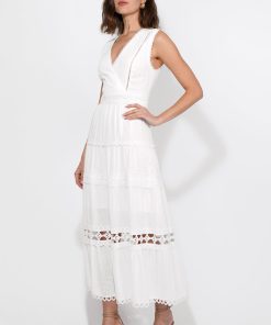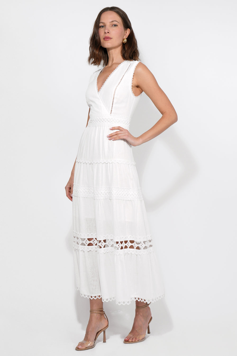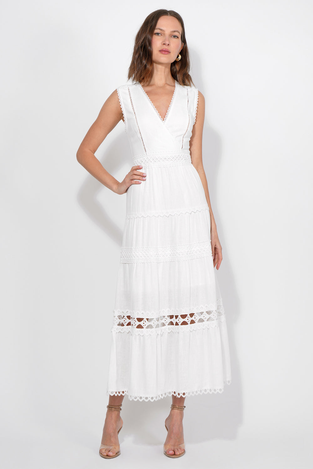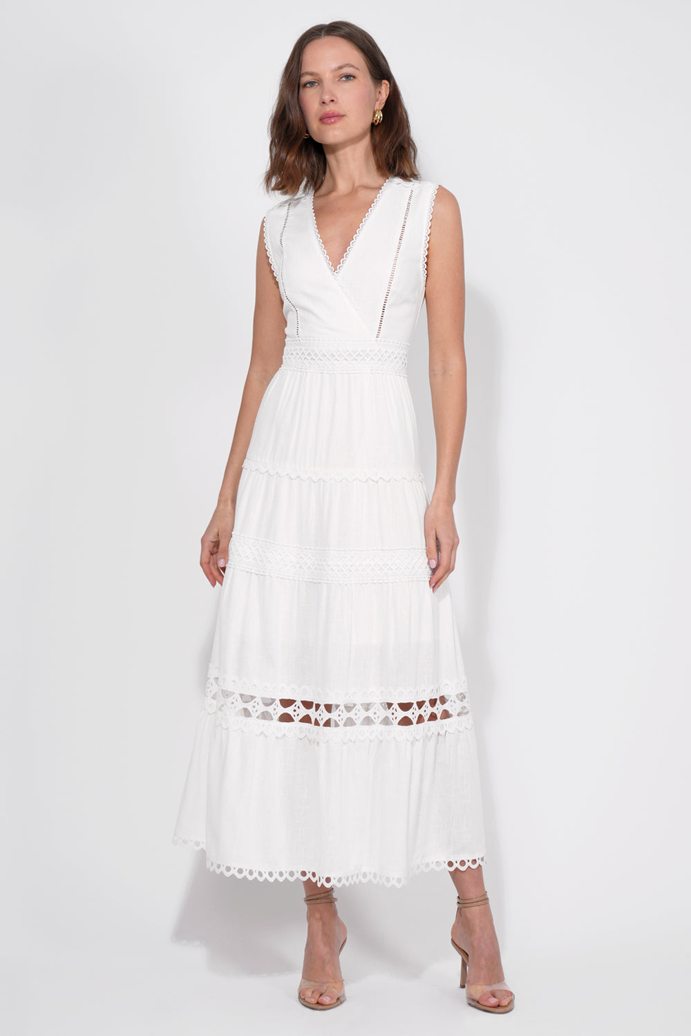 Designed with delicate lace paneling, a flattering faux-wrap bodice, and a tiered skirt that flows with every step, this dress was made for twirling. The scalloped edges and peekaboo details add a touch of whimsy, while the lightweight fabric keeps things breezy.