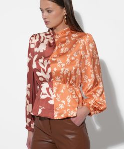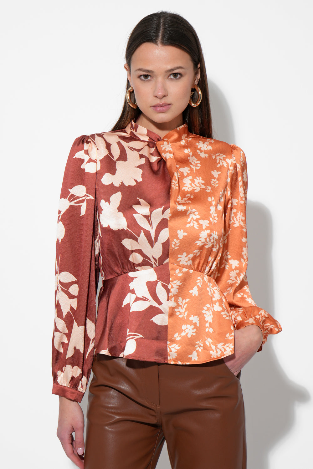 This sophisticated long-sleeve blouse makes a striking statement with its chic two-toned design, featuring a rich, darker-hued body beautifully contrasted by crisp, lighter-toned sleeves and a refined mock neck. Designed with a relaxed fit, it offers both comfort and modern elegance.